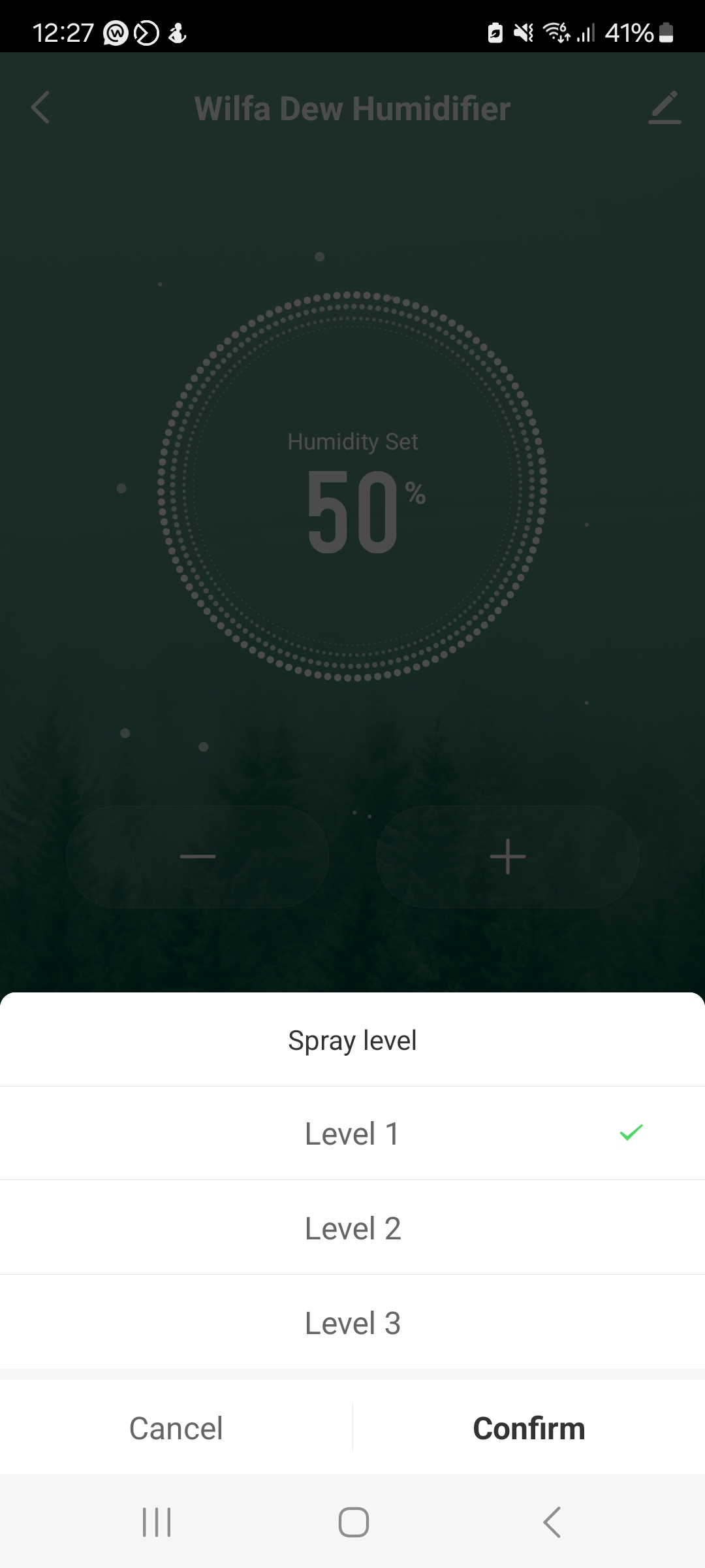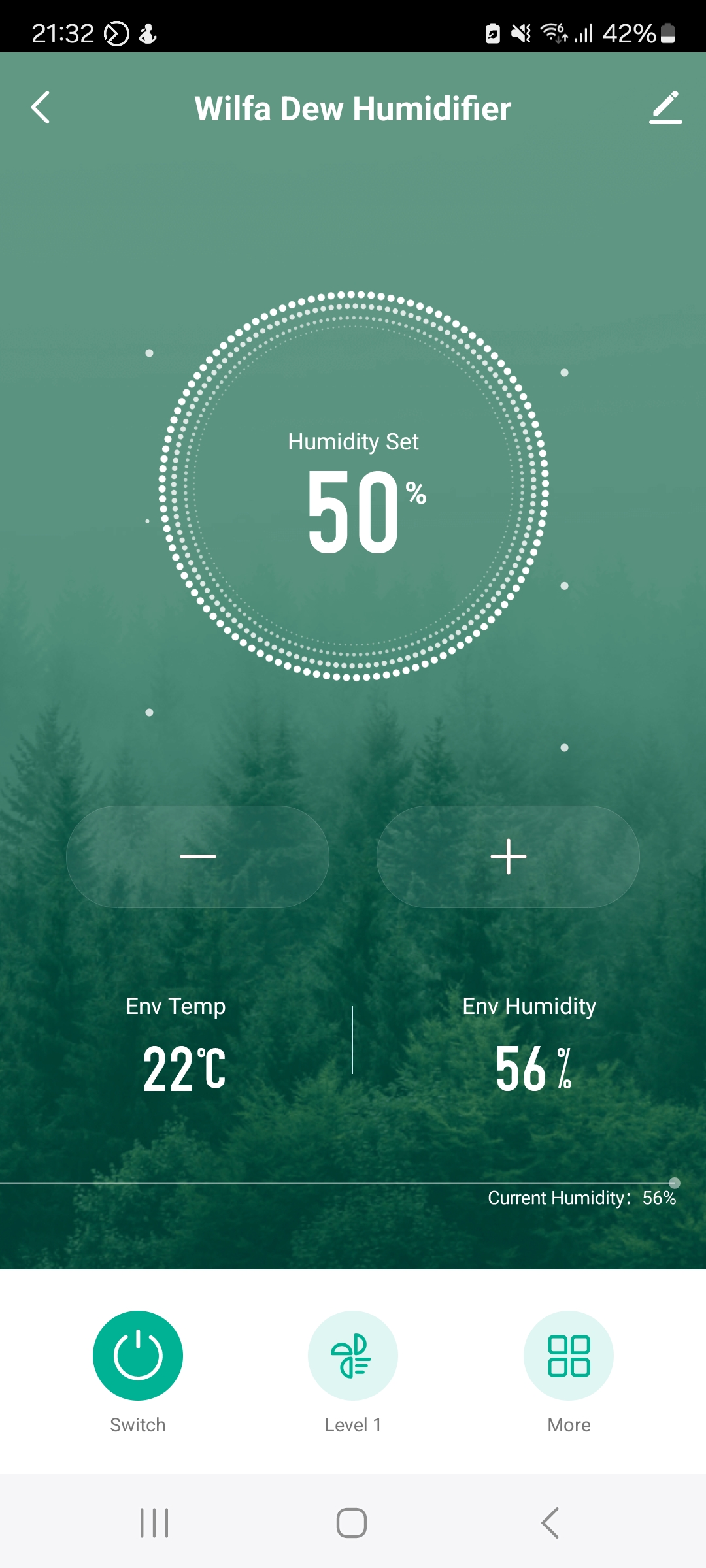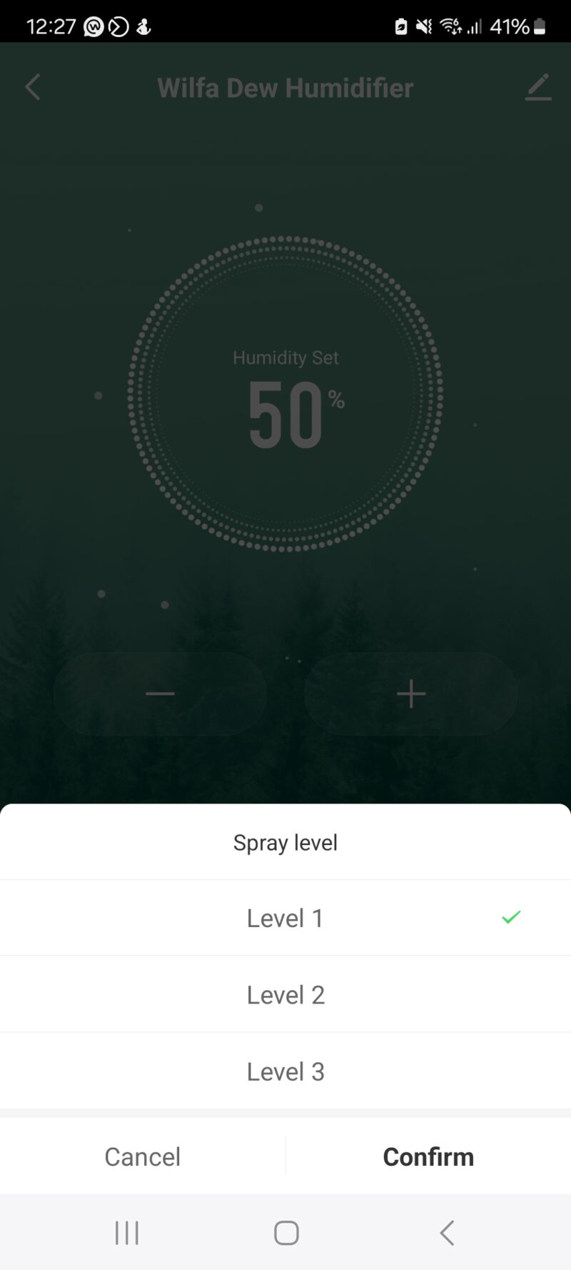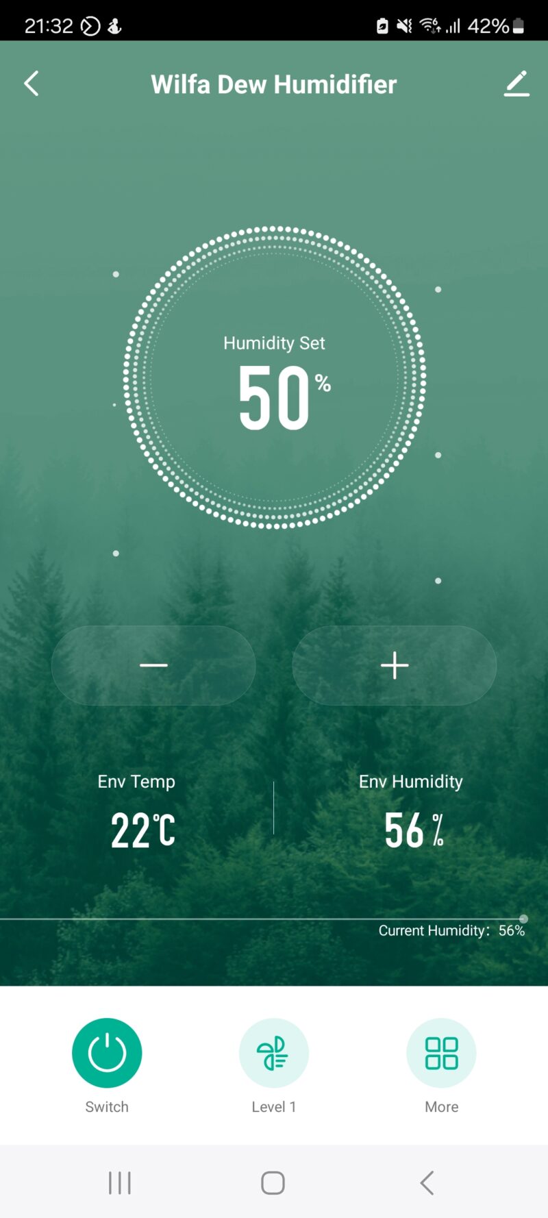 Sovelluksesta voi valita halutun ilmankosteuden, säätää höyryn määrää ja laittaa päälle ajastuksen. En kuitenkaan löydä mahdollisuutta luoda aikataulua. Valmistajan mukaan sovelluksesta näkyy myös, milloin vesisäiliö kaipaa täyttämistä – mutta se ei ole sama asia kuin jäljellä olevan vesimäärän tarkistaminen. Sellaista ominaisuutta kaipaisin.