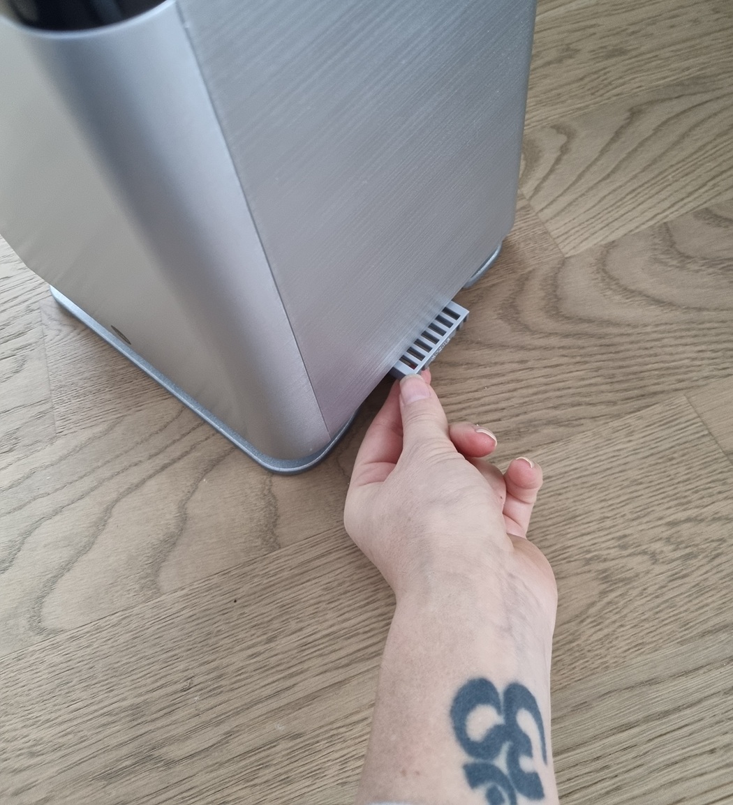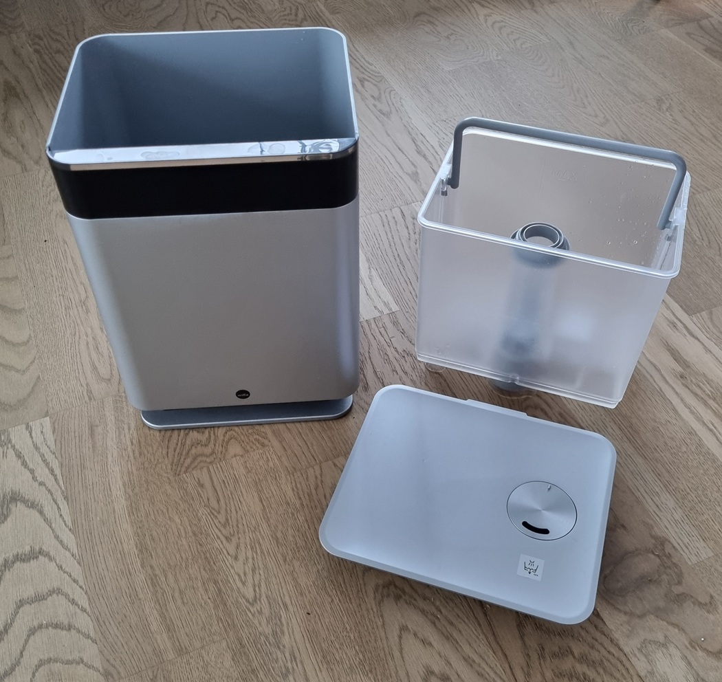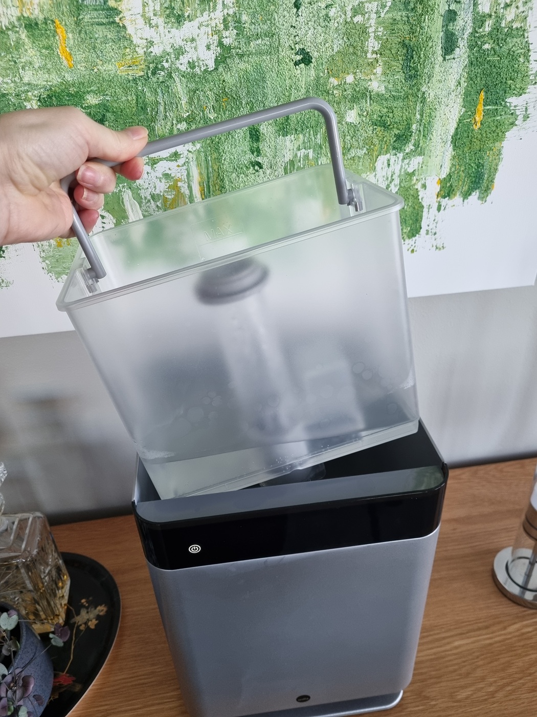 Säiliön täyttämiseksi tarvitsee vain nostaa kansi ja ottaa kahvallista ämpäriä muistuttava sisäosa ulos. Se on helppo kantaa hanan ääreen, täyttää merkkiviivaan asti ja viedä takaisin paikoilleen.