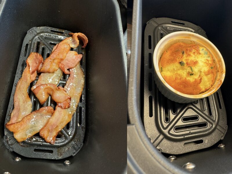 Jokaista vertailun airfyeriä käytettiin tavalliseen ruuanlaittoon viikon ajan. Näin laitteiden käytöstä ja äänitasosta sai hyvän käsityksen. Valmistin kaikissa joitakin samoja ruokia, jotta vertailu oli helpompaa: pekonia, kananmunaa, leivitettyä kalaa, ribsejä ja tietenkin pakasteranskalaisia. Mittasin, miten nopeasti laitteet lämpenivät 180 asteeseen sekä sitä, kuinka vakaasti ne pitivät valitun lämpötilan. Lämpötilan tarkkailuun käytin Weber Connect Smart Grilling Hubia, jossa on kaksi lämpötila-anturia ja joka näyttää lämpötilavaihtelut käyränä.
