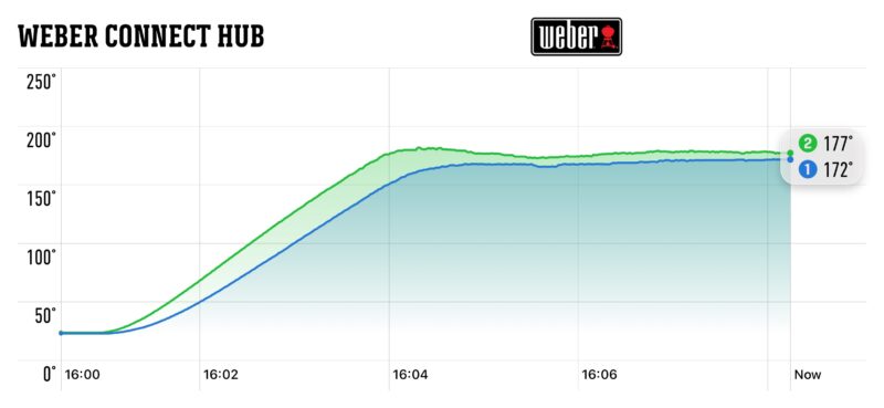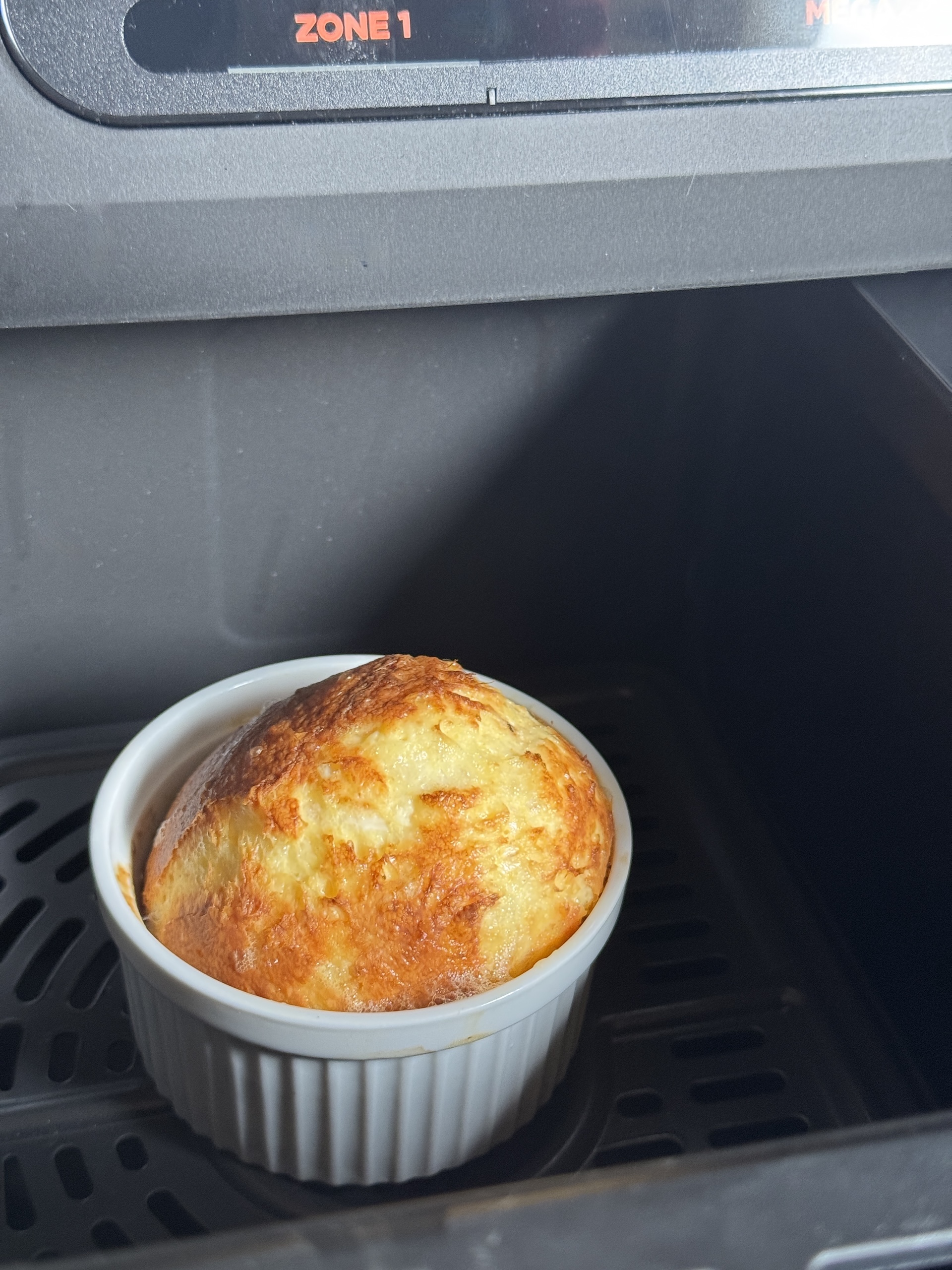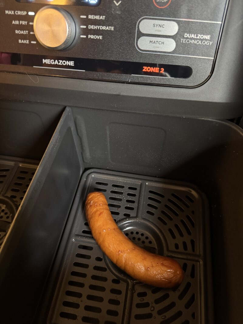 Air fry -asetuksen perustila on 200 astetta ja 20 minuuttia, mutta arvot voi vaihtaa nopeasti. Lämmityksen aikana kammioiden välillä on 30 asteen ero, mikä on vähän huolestuttavaa. Toinen kori pääsee 180 asteeseen 3 minuutissa ja 21 sekunnissa, jonka jälkeen lämpötila jää pyörimään 175 ja 180 asteen väliin. Ensimmäinen kori taas saavuttaa 170 asteen lämmön keskinkertaisessa 4 minuutin ja 10 sekunnin ajassa, ja pitää lämmön sitten samana. Ei mikään katastrofi, mutta outoa silti, että koreissa on näin paljon eroa. Käytännössä laite kuitenkin toimii hyvin ja kaikki onnistui hyvin pekonista munaruokiin ja makkaroista gratiineihin.