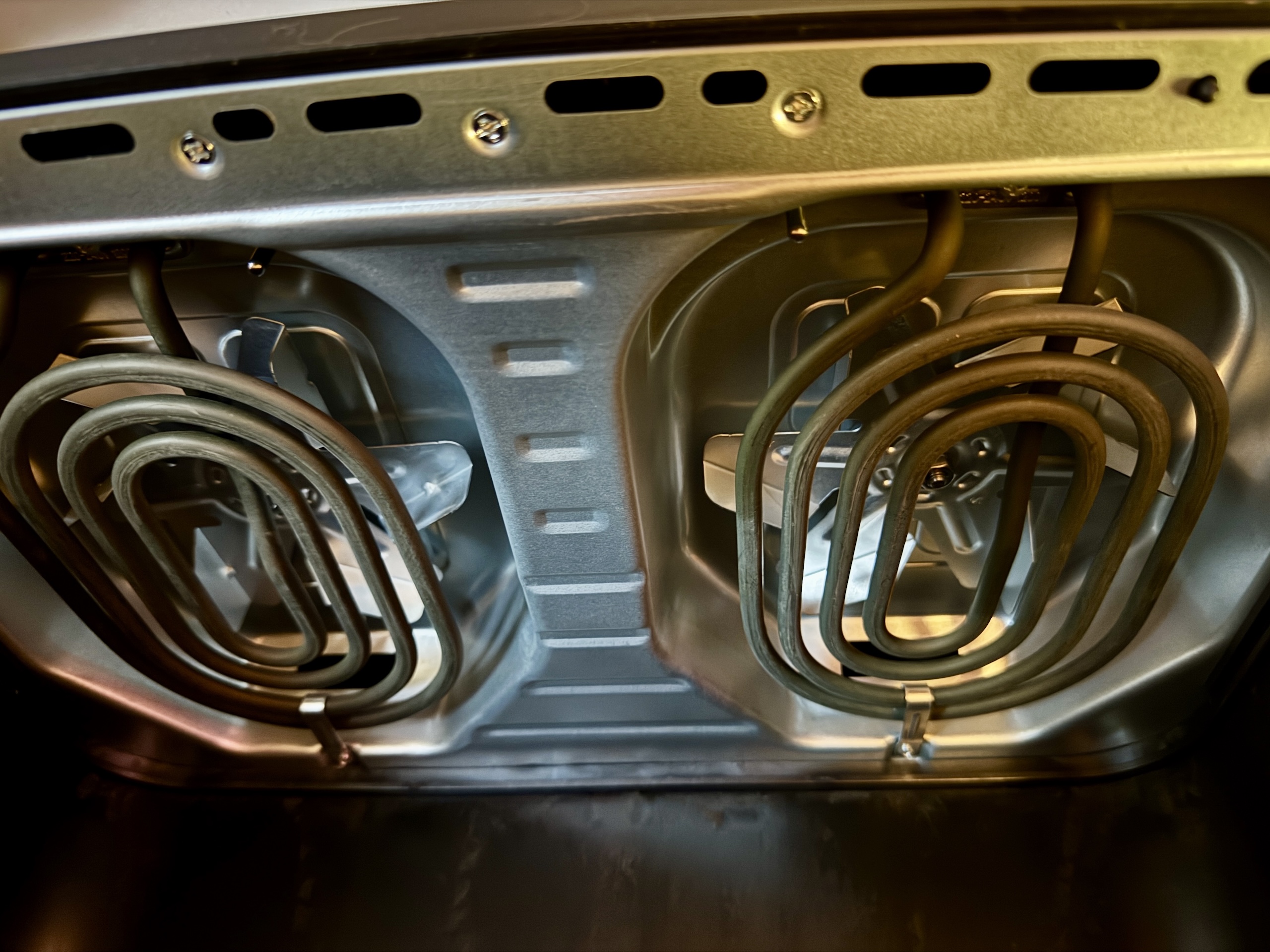 Käyttöoppaassa neuvotaan pyyhkimään kone nihkeällä liinalla. Korin, ritilät ja jakajan voi kuitenkin pestä koneessa. Lämpövastusten putsaamisesta ei ole mainintaa. Jos on ikinä käyttänyt airfryeriä, tietää, että vastuksiin roiskuu kaikenlaista. En näe, miksei tässäkin voisi käyttää tiskiharjaa vastusten putsaamiseen, joten niin myös tein eikä mitään ikävää sattunut.