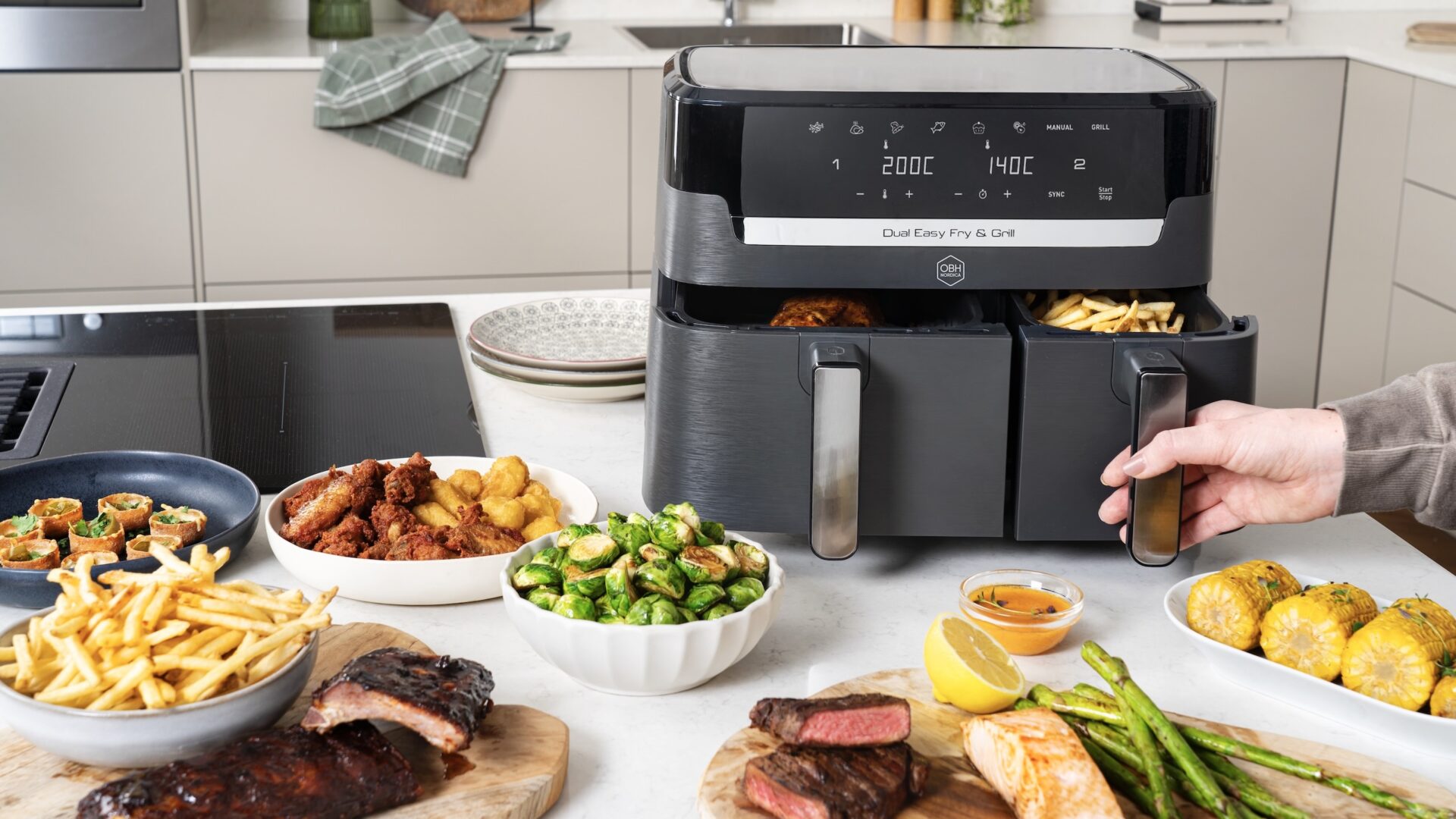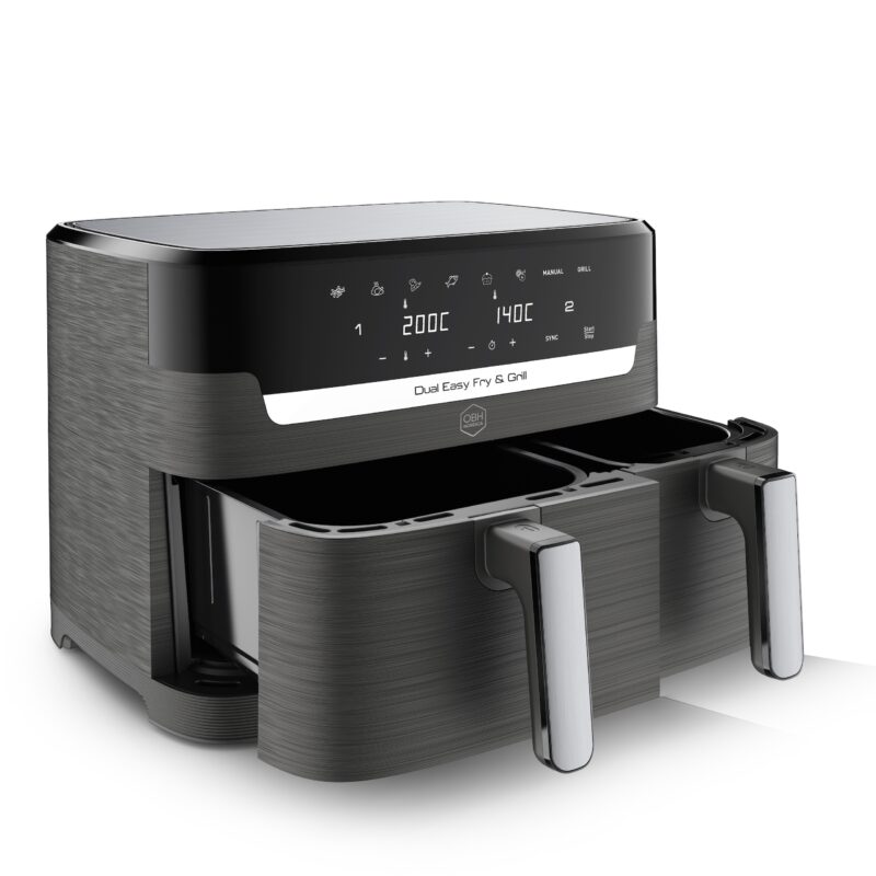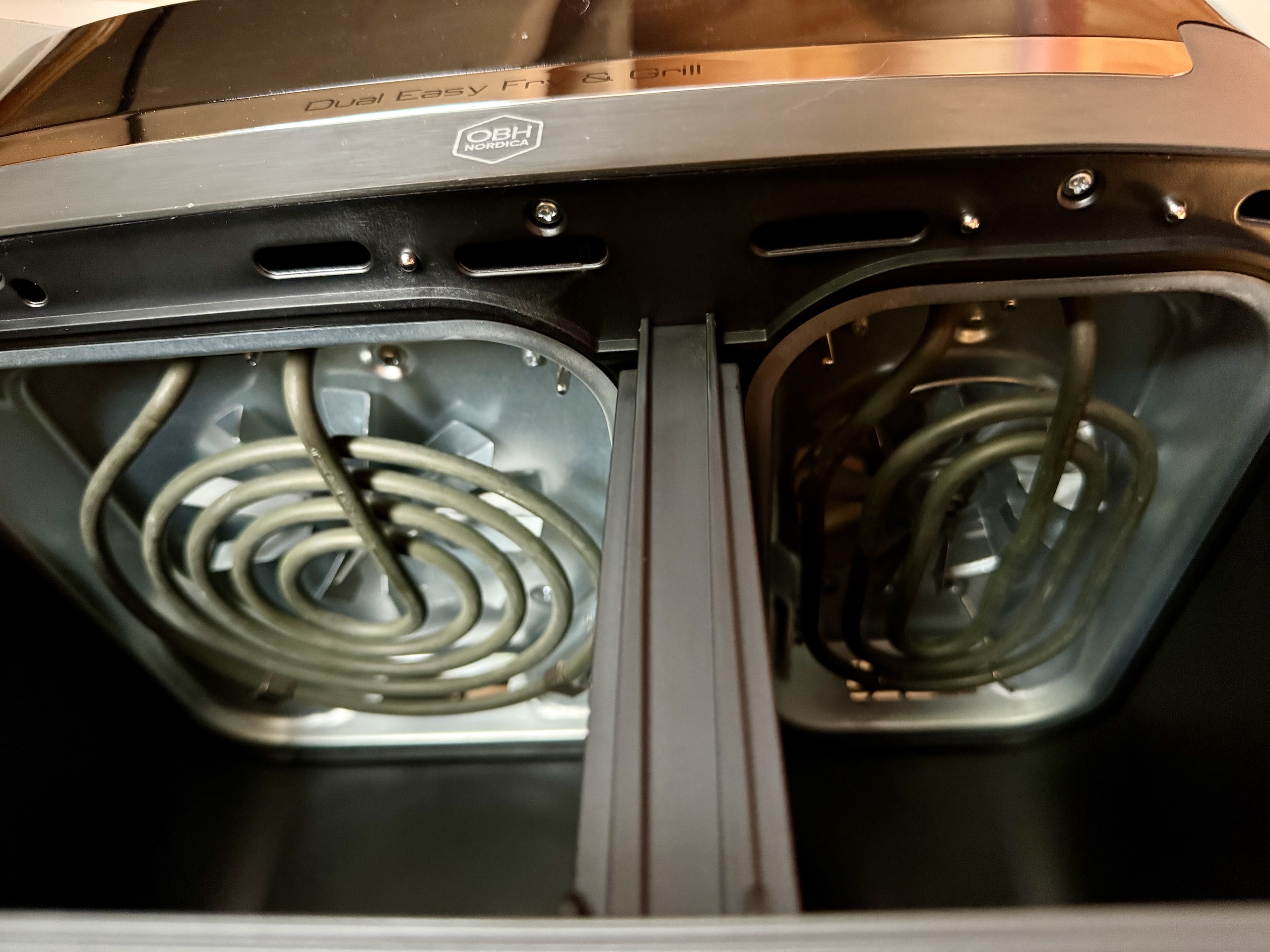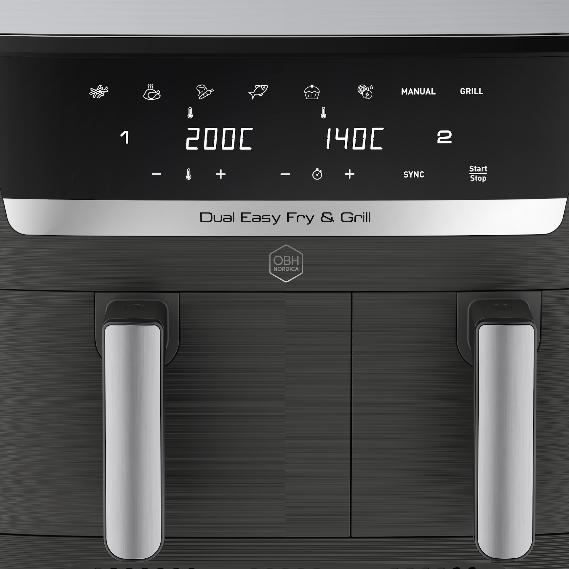 OBH Nordica Dual Easy Fry & Grill näyttää ensisilmäyksellä houkuttelevalta. Se on helppo puhdistaa ja kosketusnäyttö on selkeä. Kaksi erikokoista koria on kätevä vaihtoehto, jos ei käyttöä jättikorille ole. Tässä mallissa iso kori on tosin varustettu grilliritilällä, jota ei saa vaihdettua eikä laitteen lämpötila kuitenkaan riitä grillaamiseen. Kun juoksee kymmenettä kertaa keittiöön sammuttamaan merkkiääntä, koska sen unohti poistaa esiasetetusta ranskalaisohjelmasta, voi hermo olla aika kireällä.
