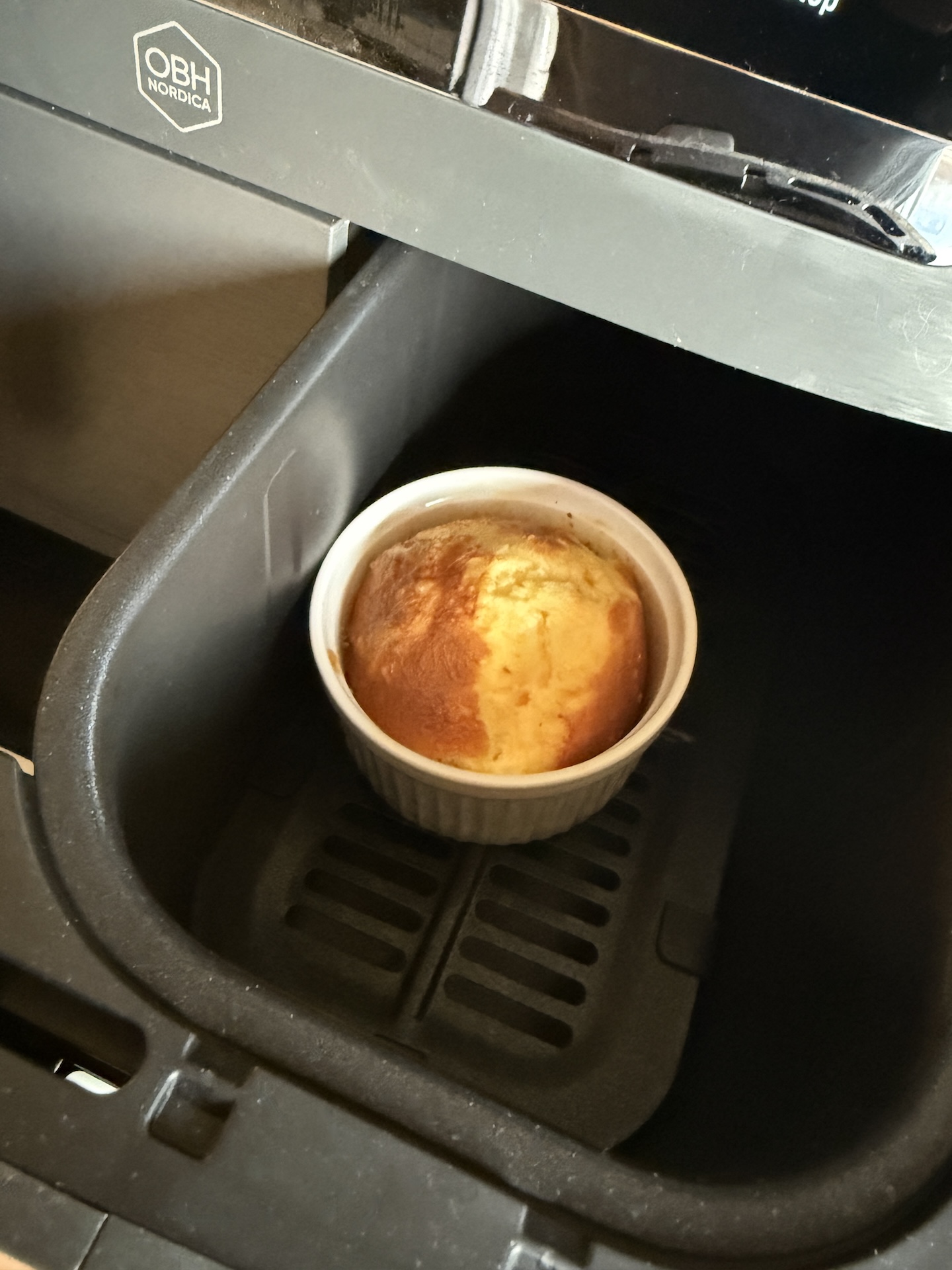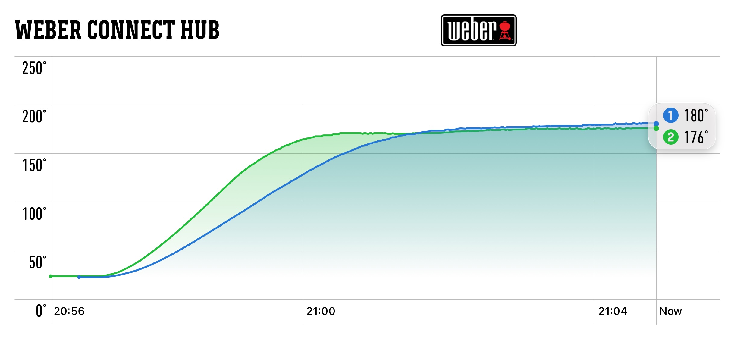 On ymmärrettävää, että isolla ja pienellä korilla kestää eri aika lämmetä. On kuitenkin aika kohtuutonta, että lämmityksessä ero voi olla jopa 40 astetta. Pieni kori pääsi 3 minuutissa ja 10 sekunnissa 170 asteeseen, ja lopulta se yltää 175 asteeseen, johon se jää. Isommalla korilla kestää 4 minuuttia ja 15 sekuntia lämmetä 170 asteeseen, ja viisi minuuttia 180 asteeseen. Sen jälkeen kori säilyttää oikean lämpötilan. Toisin kuin grillaus, onnistuivat munaruokien, pekonin, ranskalaisten ja kanansiipien valmistaminen hienosti.