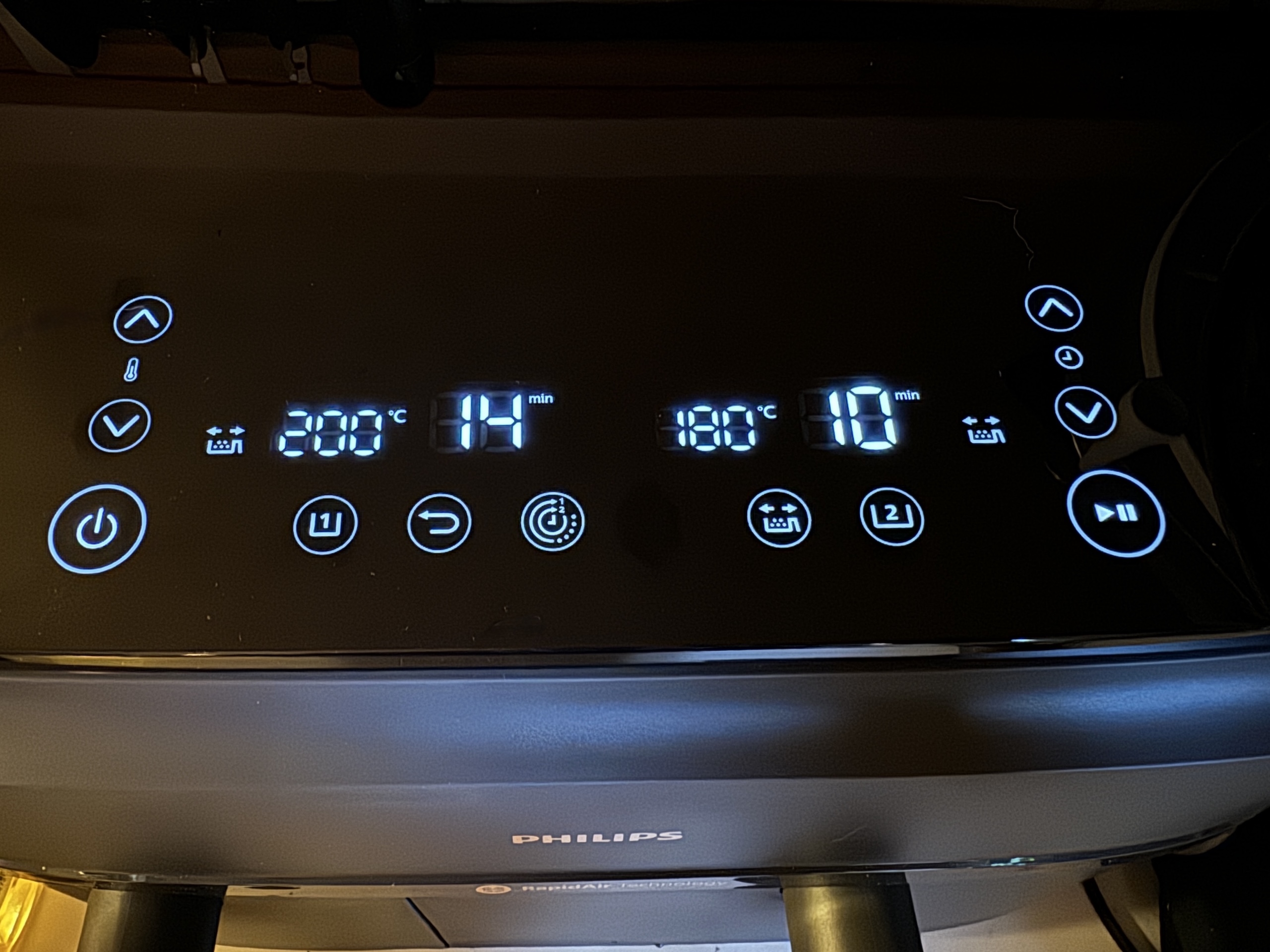 Philips 3000 Dualbasketissa on todella hieno kosketusnäyttö. Mutta siihen ilo loppuukin, sillä jostain käsittämättömästä syystä Philips on sijoittanut näytön laitteen kanteen. Niinpä lapset tai lyhyemmät aikuisetkaan eivät näe näyttöä kiipeämättä jakkaralle. Ääliömäistä. Näyttö myös estää laittamasta mitään laitteen päälle – sehän toki on muutenkin vastoin suosituksia mutta kaikkihan niin silti tekevät. Näyttö on kuitenkin melko fiksu, sillä vain tarvittavat symbolit valaistuvat. Joidenkin symbolien merkitys aukeni vasta, kun lukaisin niiden toiminnoista digitaalisesta käyttöoppaasta.