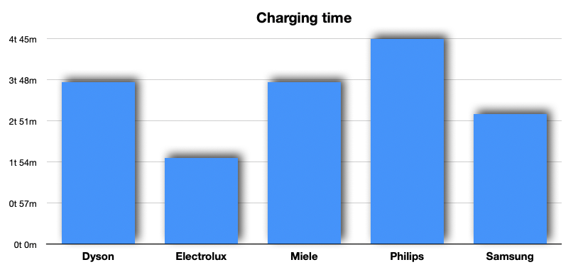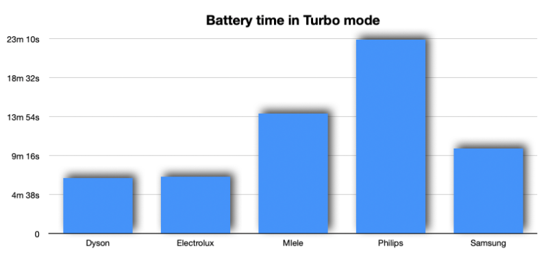Peukalon kohdalta löytyy on/off-nappi ja imutehon säätönappi: eco, perus tai turbo. Laite tunnistaa lattiapinnan ja osaa säätää imutehoa itsekseen. Ohjainten yläpuolella on pieni näyttö, josta näkee akun ja suodattimen tilan ja jonka valikosta voi säätää ajovalon kirkkautta ja lattian tunnistusta. Moottoriosa on testin kevyimpiä, ja laitteen akunkesto on erinomainen. Philipsin mukaan akku kestää eco-asetuksella 80 minuuttia ja turboteholla 30 minuuttia. Omassa turbokäytössäni akku kesti 23 minuuttia, mutta se on silti pari-kolme kertaa parempi kuin tulos kuin vertailun muilla imureilla!
