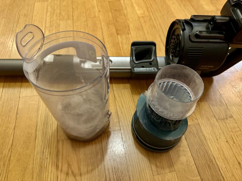 Kerrankin pölysäiliön tyhjennys ei vaadi insinöörintaitoja ja erityistä sorminäppäryyttä. Painetaan vain nappia ja säiliö irtoaa. Suodatin vedetään irti ja säiliön sisältö kaadetaan roskapussiin. Koska säiliössä ei ole mitään koloja ja rakoja, ei sinne jää pölyä, vaan se tyhjenee oikeasti kerralla. Suodattimen voi pestä hanan alla tarvittaessa. Moottorisuulakkeisiin ei erityisemmin jäänyt karvoja kiinni, mutta jos jää, ne saa helposti käsin. Loistavaa!