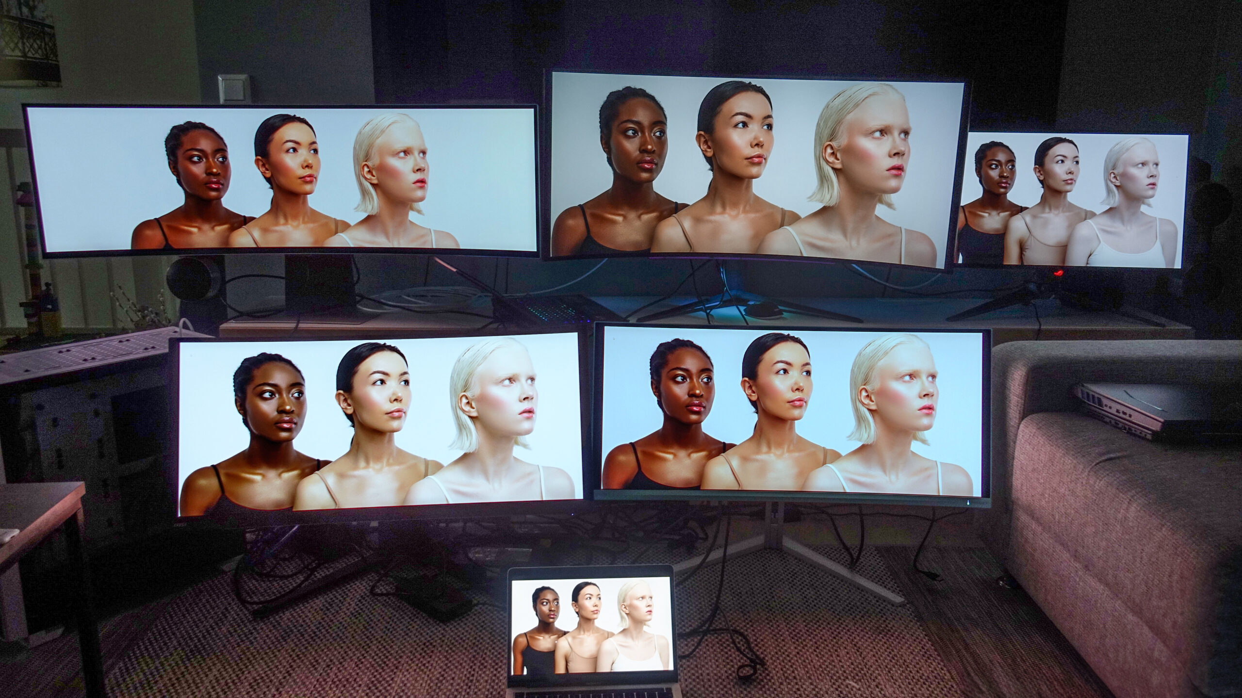 Testin osallistujat edustavat tarkoituksella vähän eri tyyppejä, jotta testi toimisi samalla myös läpileikkauksena siihen, mitä markkinoilla on tällä hetkellä tarjota. Niinpä mukana on 27-tuumainen 16:9-kuvasuhteen näyttö (ROG), ultralaaja 32:9-kuvasuhteen 49-tuumainen (Samsung) ja erityisen kaareva ja leveä 21:1-formaatin 45-tuumainen (LG). Lisäksi on kaksi tavallisempaa 34-tuumaista 21:9-kuvasuhteen näyttöä (MSI ja Philips).