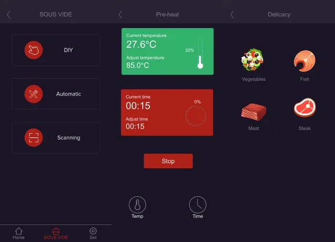 Laitteen päällä olevat symbolit eivät ole erityisen intuitiivisia. On/off-napin näköistä säädintä käytetään sirkulaattorin käynnistämiseen, ja asetussäätimen näköistä nappia seuraavaan vaiheeseen siirtymiseen. Käyttöohjeet ovat onneksi saatavilla myös suomeksi. Sovelluskin olisi tarjolla, mutta en onnistunut yhdistämään sovellusta ja laitetta keskenään. Teknisen tuen mukaan laitteessa oli jotain vikaa, mutta emme ehtineet saada testiin uutta versiota. Niinpä en voi arvioida sovellusta millään lailla.
