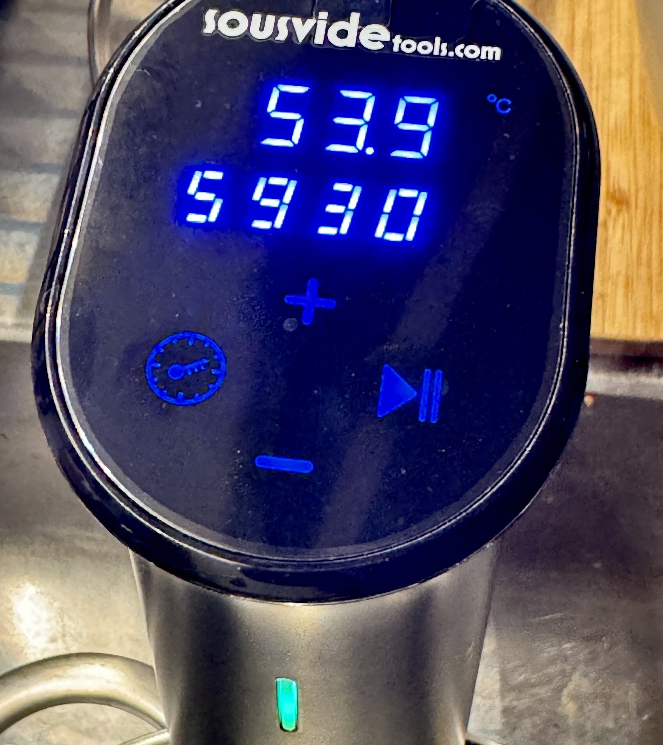 Napit ovat selkeät ja näyttö käytännöllinen kertoessaan sekä lämpötilan että jäljellä olevan ajan. Lämpötilaa voi säätää asteen kymmenyksen tarkkuudella, missä ei tunnu olevan järkeä. Onneksi laite muistaa aiemman valinnan. Työtä helpottaa, jos ottaa käyttöön sovelluksen. Sen reseptiarkistosta löytyvät oikeat ajastukset ja lämpötilat parilla napautuksella. Sohvalta voi sitten tarkistaa jäljellä olevan ajan, joskin se saisi olla sovelluksessa selkeämmin esillä.