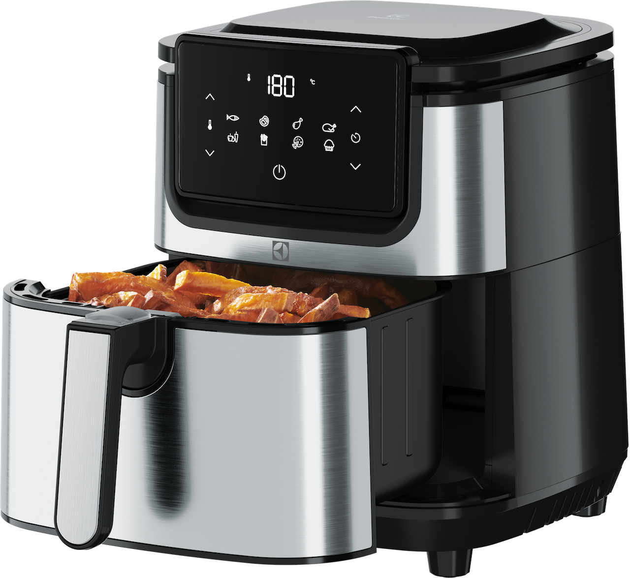 Perusasetus on 180 astetta ja 15 minuuttia, mikä on hyvä. Electrolux lämpeni 180 asteeseen 3 minuutissa 5 sekunnissa, mutta lämpötila jäi pyörimään 180–190 asteeseen, mikä on aika iso heitto. Termostaatti ei ilmeisesti ole kovin hyvä. Ranskalaisohjelma toimi vertailun alhaisimmalla lämpötilalla ja kestolla, ja ne odotetusti jäivätkin niin vaaleiksi, että jatkoin paistamista vielä hetken. Poikkeuksellisesti Explore 6 ei käske ravistella tai käännellä ruokaa kypsennyksen aikana, joten on tajuttava käyttää omaa ajastinta tähän. Manuaaliohjelmalla sekä pekonista että minimunakkaista tuli hyviä, kun valitsin ajan ja lämpötilan oman kokemukseni perusteella.