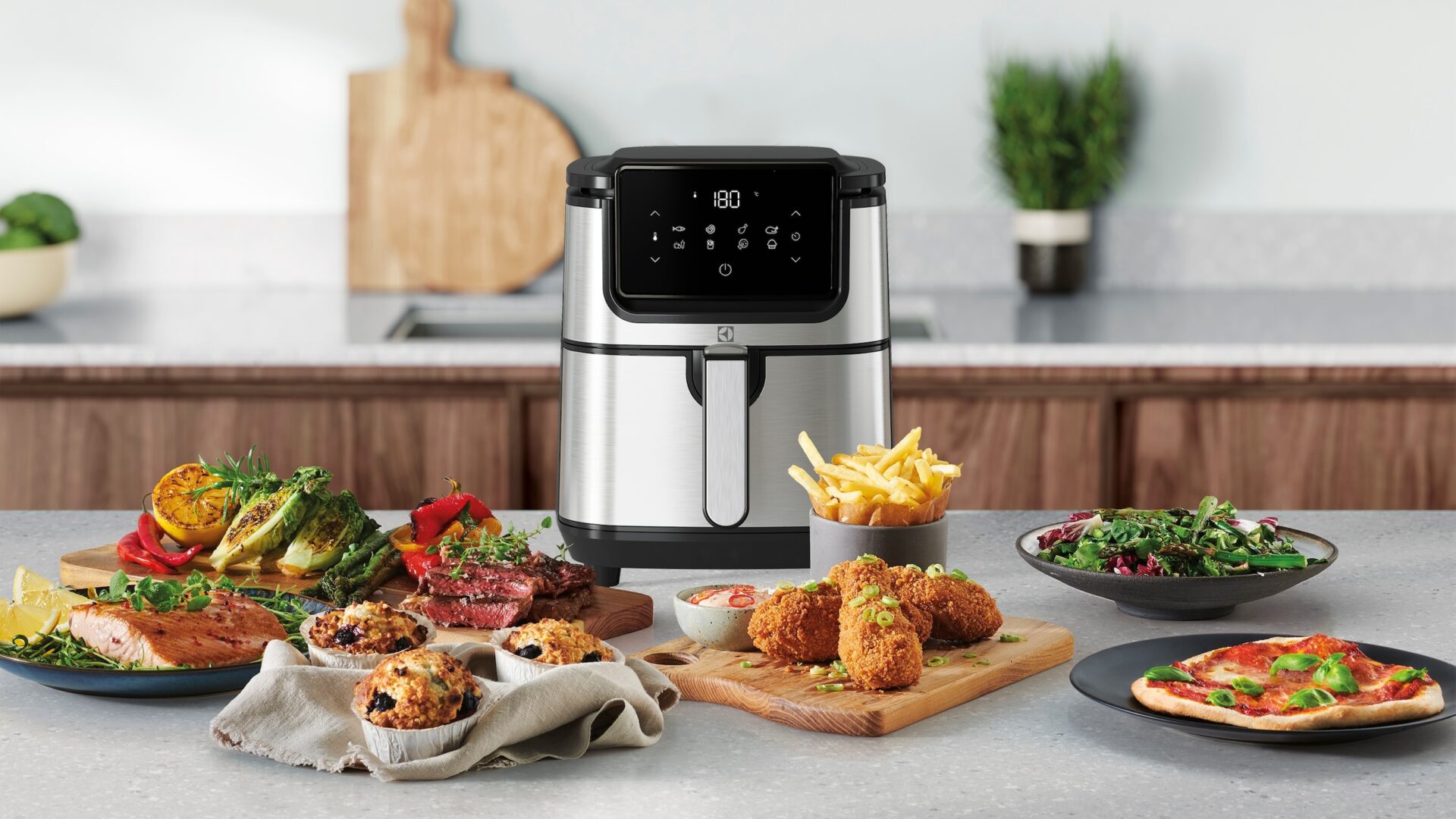 Electroluxin valikoimiin kuuluu kolme airfryeria: kaksi Explore 6 -mallia, joista vertailuumme valikoitui suurempi, sekä pieni ja Explorea puolet halvempi Create 5. Lisävarusteet eivät kuulu kauppaan, mutta erikseen voi ostaa Air Fryer Culinary Expansion Kit -nimisen setin, johon kuuluu kakkuvuoka, kolme grillivarrasta ja ritilä sekä spriaalileikkuri kasviksille. Sama setti toimii kaikissa yli kolmelitraisissa airfryereissa. Pakkauksesta löytyy laitteen lisäksi pieni reseptikirjanen, jotka esittelevät kahdeksan ohjeen muodossa, mitä pikaohjelmilla voi tehdä.