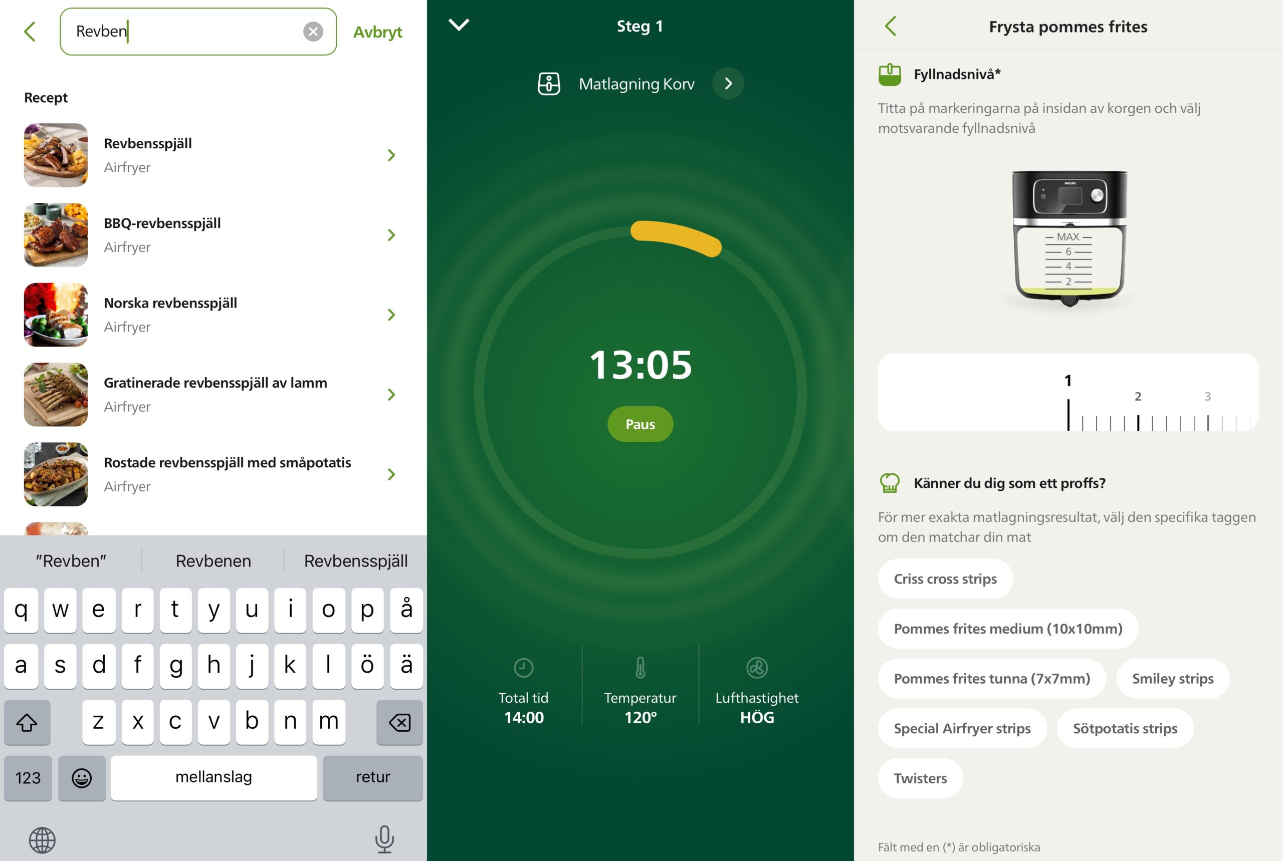 Sovellukseen voi sen sijaan lisätä suosikkinsa heti aloitusnäyttöön. Samasta paikasta voi myös valita manuaaliasetukset tai paistomittarin käytön. Ja eri ruokalajeille voi jopa valita tuulettimen nopeuden. Lisäksi tarjolla on vielä 73 (!) uutta pikaohjelmaa, joilla niilläkin on alavalikkonsa. Voikin kestää kauan, että löytää haluamansa. Sovelluksessa on myös satoja suomenkielisiä reseptejä ravintoarvoineen. Näin nämä asiat hoidetaan!