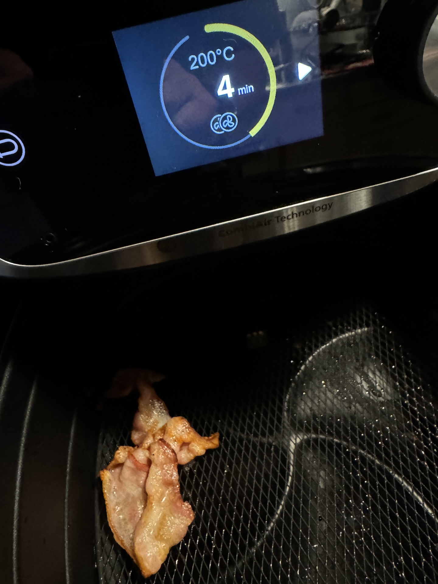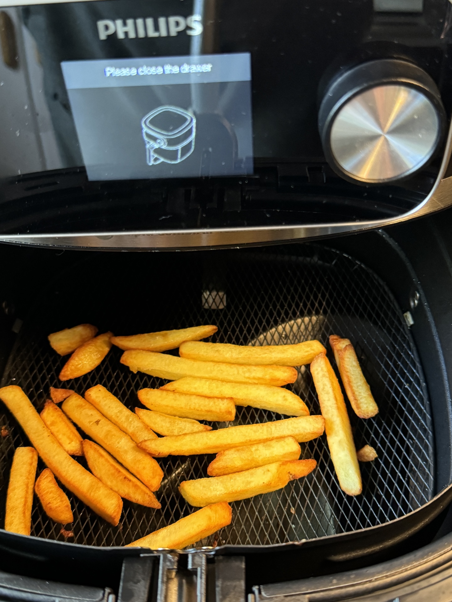 Perusasetuksena on 180 astetta, johon laite lämpeni 3 minuutissa ja 50 sekunnissa, mikä oli vähän yllättävää näin tehokkaalta koneelta, joka ei tuotesivun mukaan tarvitse esilämmittämistä. Lämpötila pysytteli sen jälkeen pari astetta 180 asteen molemmin puolin. Ranskalaisohjelma on pirullisen yksityiskohtainen, sillä siihen pitää valita perunoiden paksuus ja korin täyttöaste. Vaivannäkö palkitsi, ja perunoista tuli täydellisiä, samoin kuin minimunakkaista ja BBQ-ribseistä. Pekoniohjelma piti keskeyttää, jotteivät pekonit olisi palaneet, mikä johtui siitä, että resepti oli käyttäjän oma eikä Philipsin. Paistomittarin avulla lihasta saa täydellistä ilman, että paistoaikaa tarvitsee erikseen arpoa.