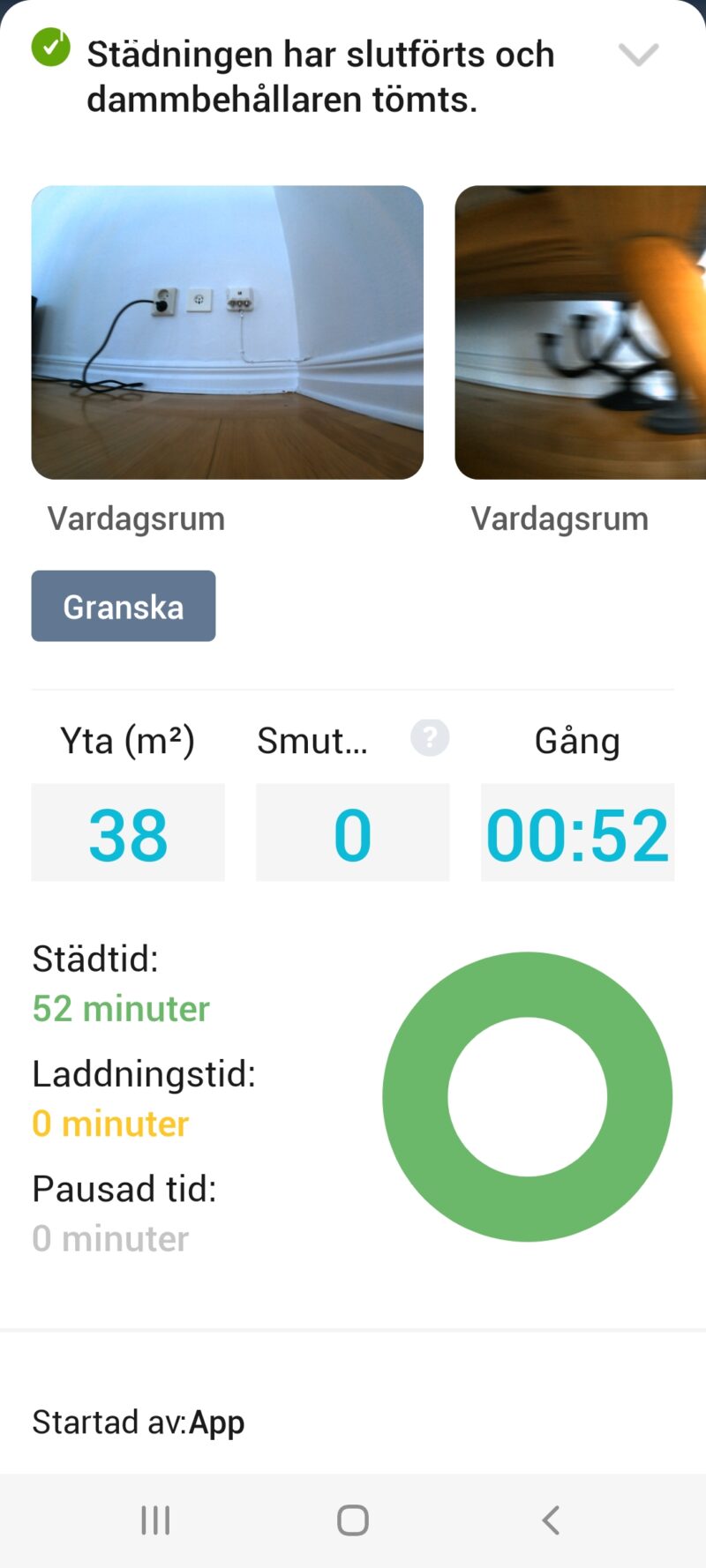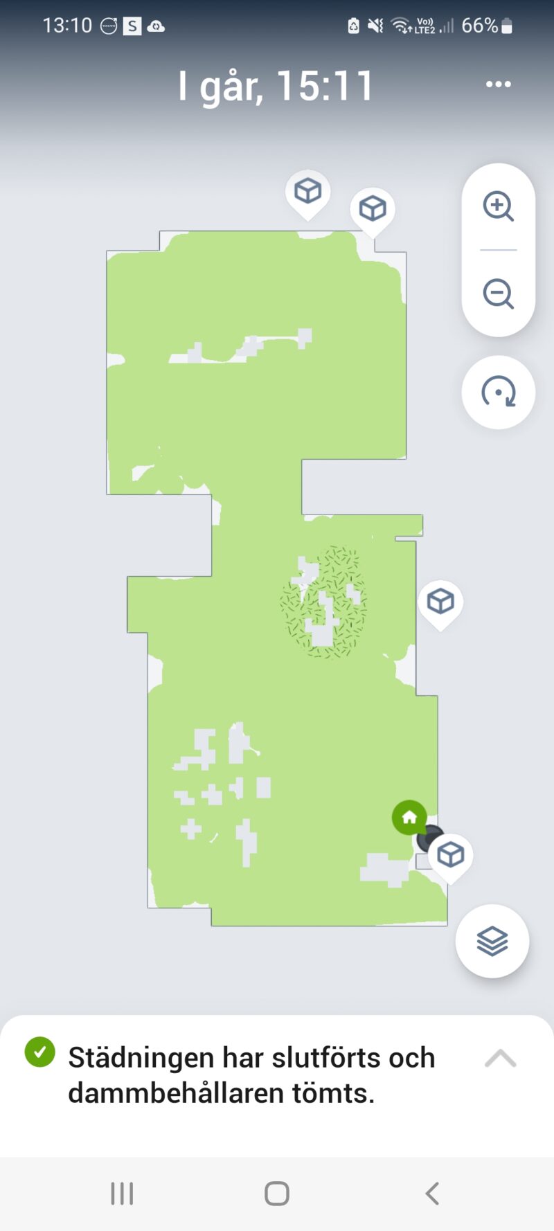 Koeajon jälkeen Märtha palaa latausasemalle ja tyhjentää pölysäiliötään noin 3 sekunnin ajan hirveän huudon saattelemana. Sovellus ilmoittaa, että iRobot Roomba j7 tarvitsee useampia siivouskierroksia ennen kuin voin mukauttaa kartan toiveideni mukaan. Lähetän Märthan uudelleen matkaan toivoen sen olevan tällä kertaa varovaisempi, mutta ehei – kukkaruukut ja tuolijalat saavat taas kyytiä.