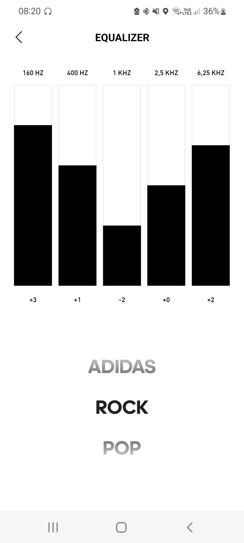 Sovelluksessa on valittavana eri ääniprofiileja: Adidas, rock, pop, hip hop, electronic, vocal boost ja oma asetus.