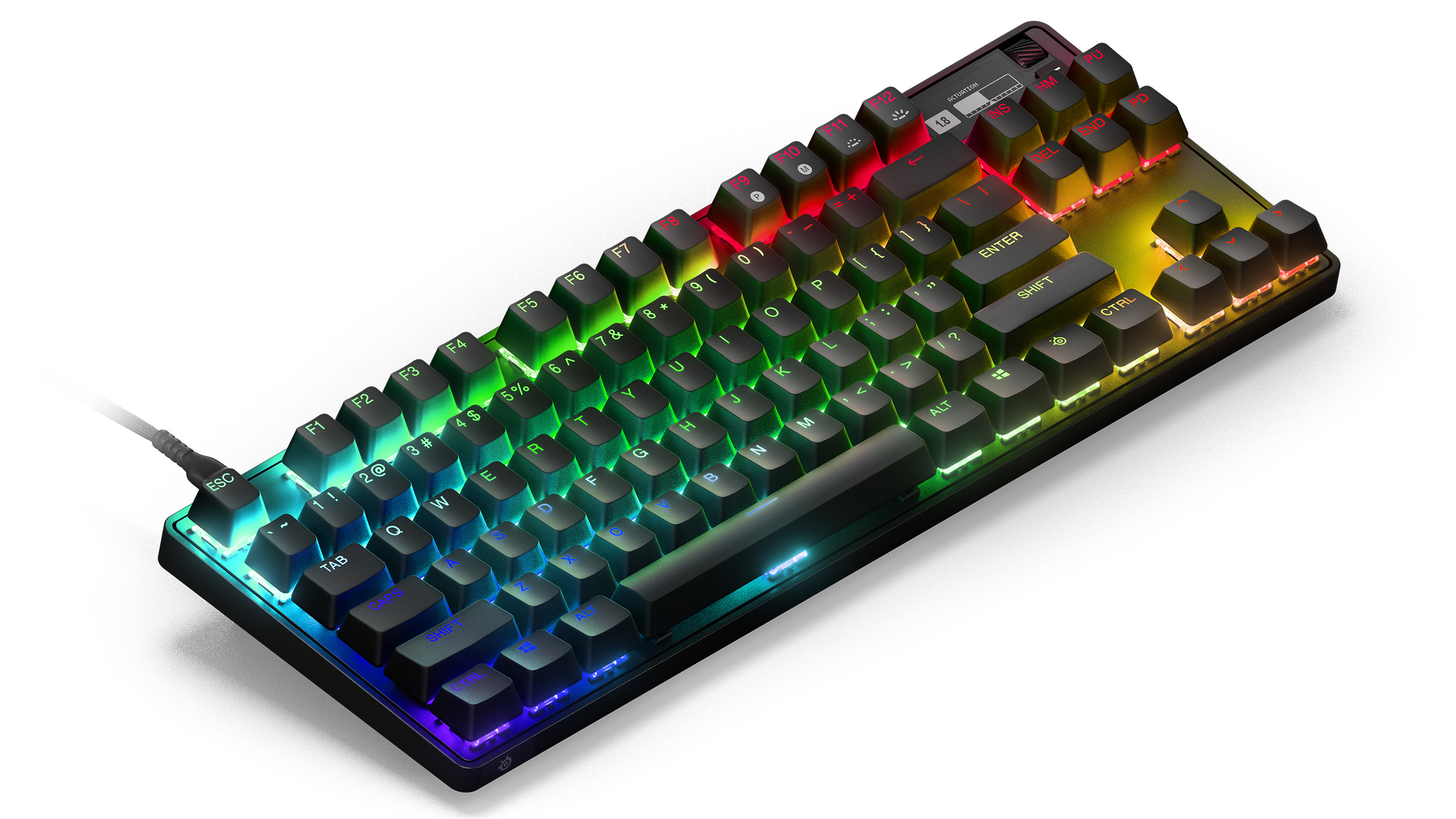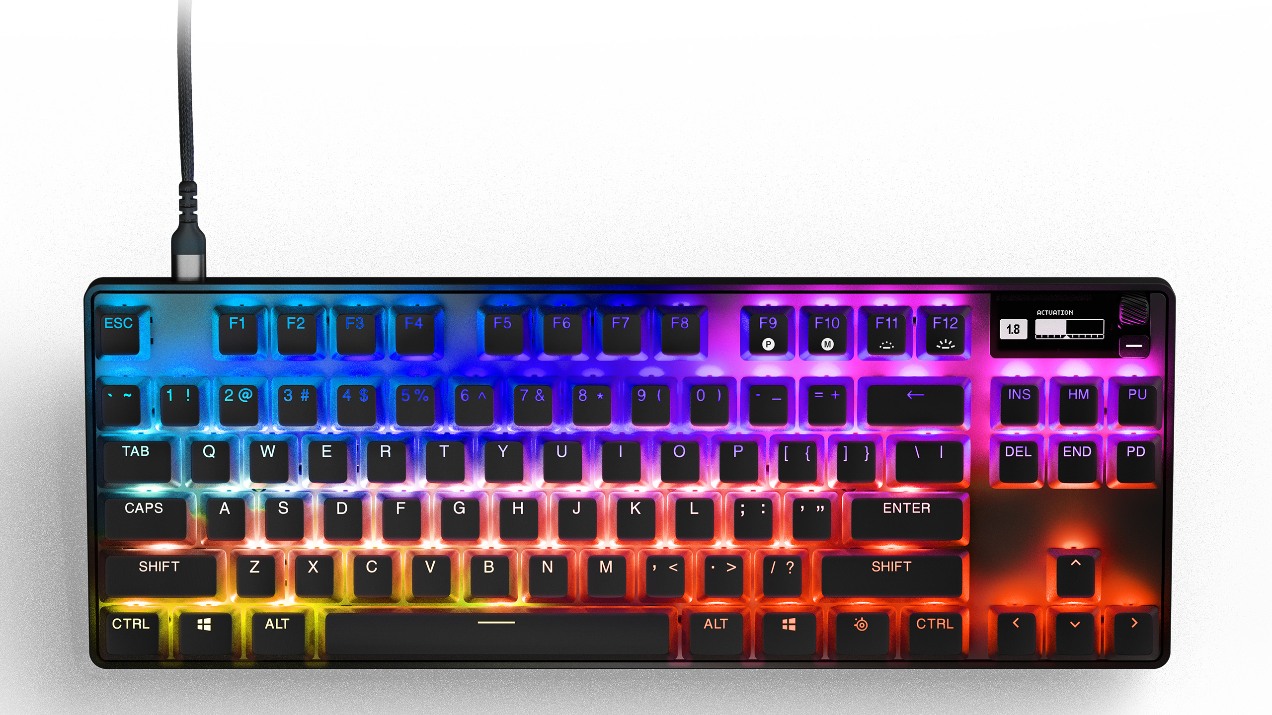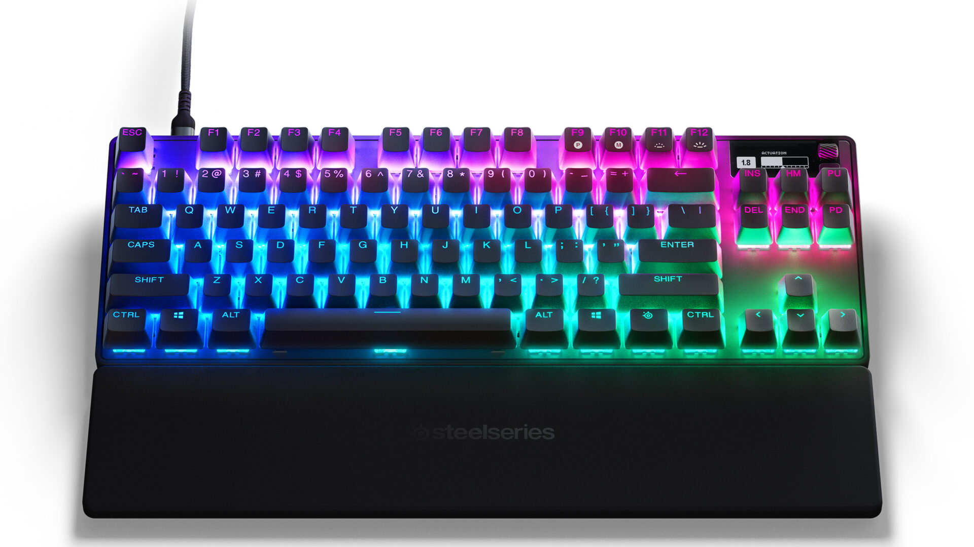 Jotta näppäimistöä ei tarvitsisi vaihtaa eri tehtävien välillä, voi Apex PRO TKL:ään tallentaa useita asetuksia, jotka saa päälle OLED-näytön valikosta. Ilmiselvistä syistä kytkimet ovat lineaariset ja napsahtamattomat, sillä kytkeytymispistettä voi muuttaa, mutta jousten mekaanista vastusta ei.