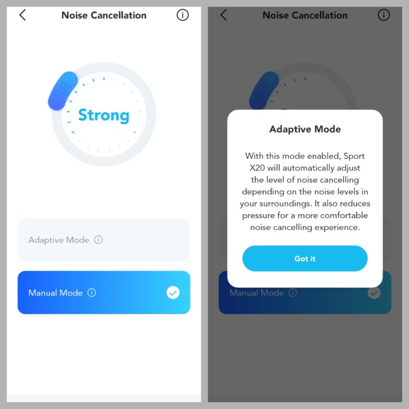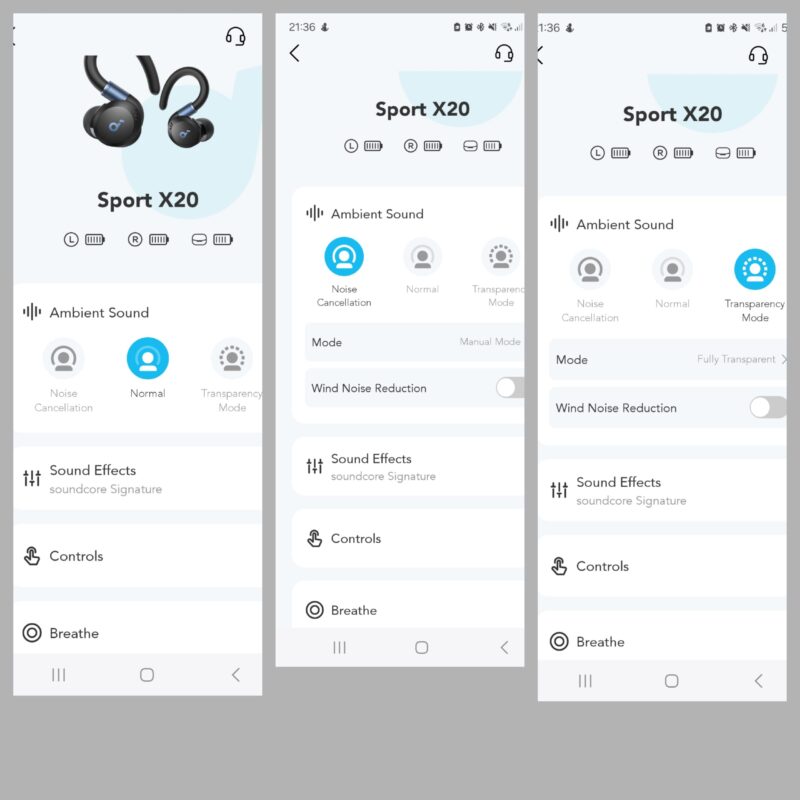 Anker Soundcore Sport X20:n vastamelusta minulla ei ole juuri sanottavaa. Se ei ole hyvää eikä huonoa, vaan aika keskinkertaista. Ruuhkaisilla teillä iso osa metelistä vaimenee, mutta ei kaikki. Vastameluasetuksia on kolme, mutta kuulokenapeista voi vaihtaa vain kahden välillä. Jos haluaa perusasetuksen, se on mentävä laittamaan päälle sovelluksesta, enkä tajua miksi.
