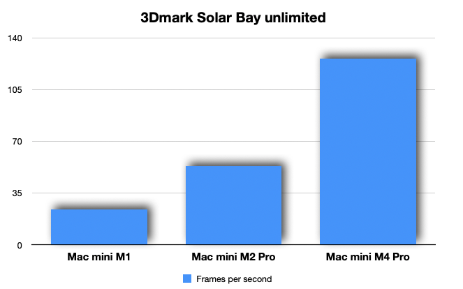 Myös muu suorituskyky on parantunut. 3D-suorituskyky on noin tuplasti parempaa kuin Mac Mini M2 Prossa, vaikka ytimiä on vain yksi enemmän. Cinebench 2024 -renderöintitesti kertoo koneen olevan kolme kertaa nopeampia grafiikkaprosessoria käyttäen. Alkaa tuntua siltä, että kone passaisi pelaamiseen, jos vain tarjolla olisi kiinnostavia pelejä. Kokonaisen konesukupolven loikka M4-tasolle johtuu kuitenkin Apple Intelligencestä eikä gaming-tehojen maksimoimisesta. Onneksi suorituskyky on kuitenkin todistettavasti kovempi. Jopa tehokkaaseen M3 Maxiin verrattuna Mini M4 Pro on tuplasti nopeampi!