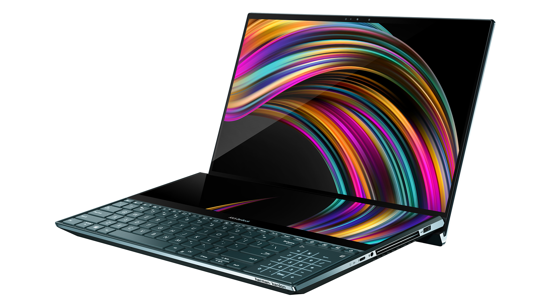 Silmiinpistävin ominaisuus ZenBook Pro Duossa on sen näytöt: niitä on toden totta kaksi. Isompi on 15-tuumainen 4K OLED -kosketusnäyttö. Näppäimistön yläpuolelta taas löytyy puolet pienempi versio. Teknisesti se on 14-tuumainen, mutta 3:1-kuvasuhteella se kattaa tietokoneen koko leveyden.