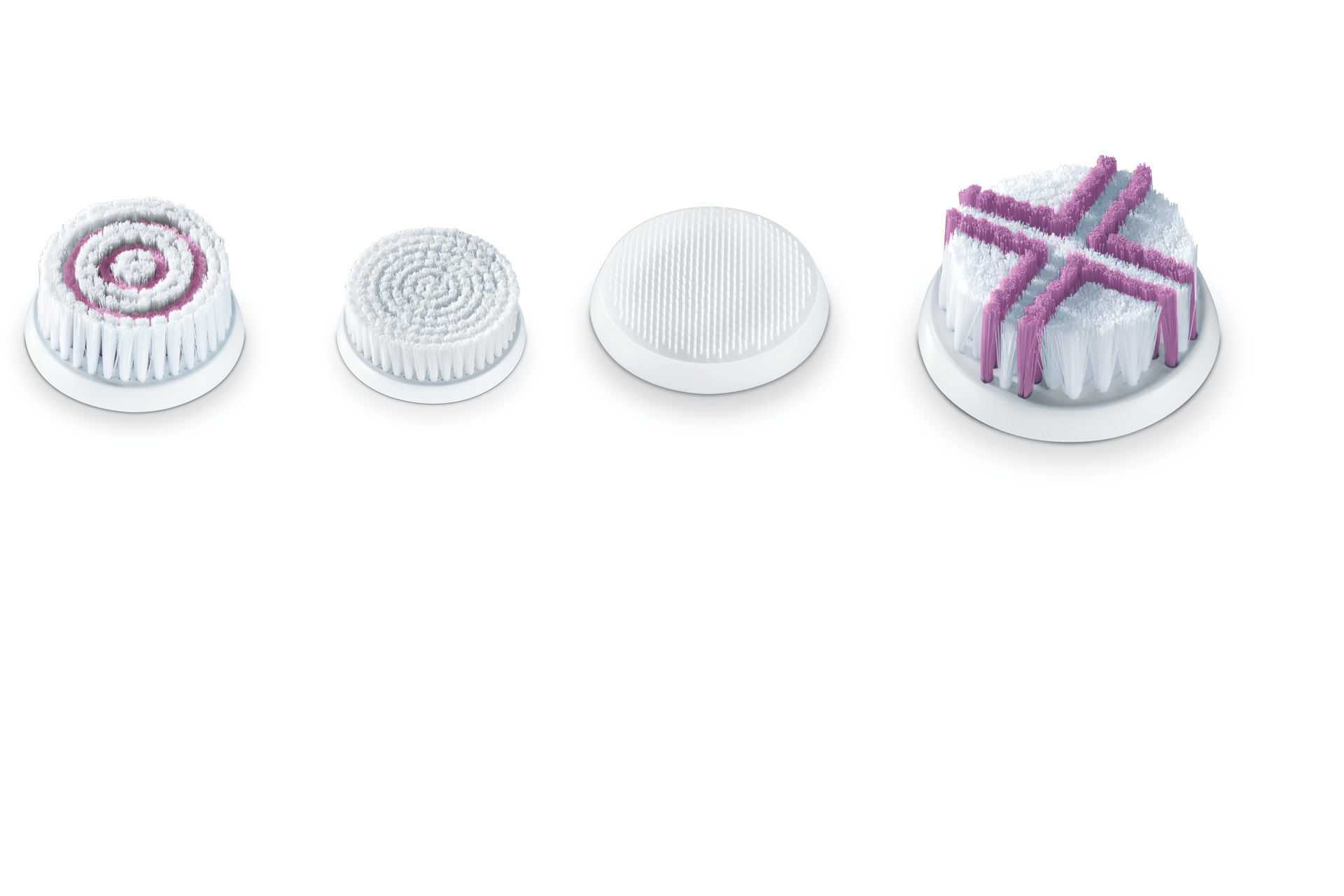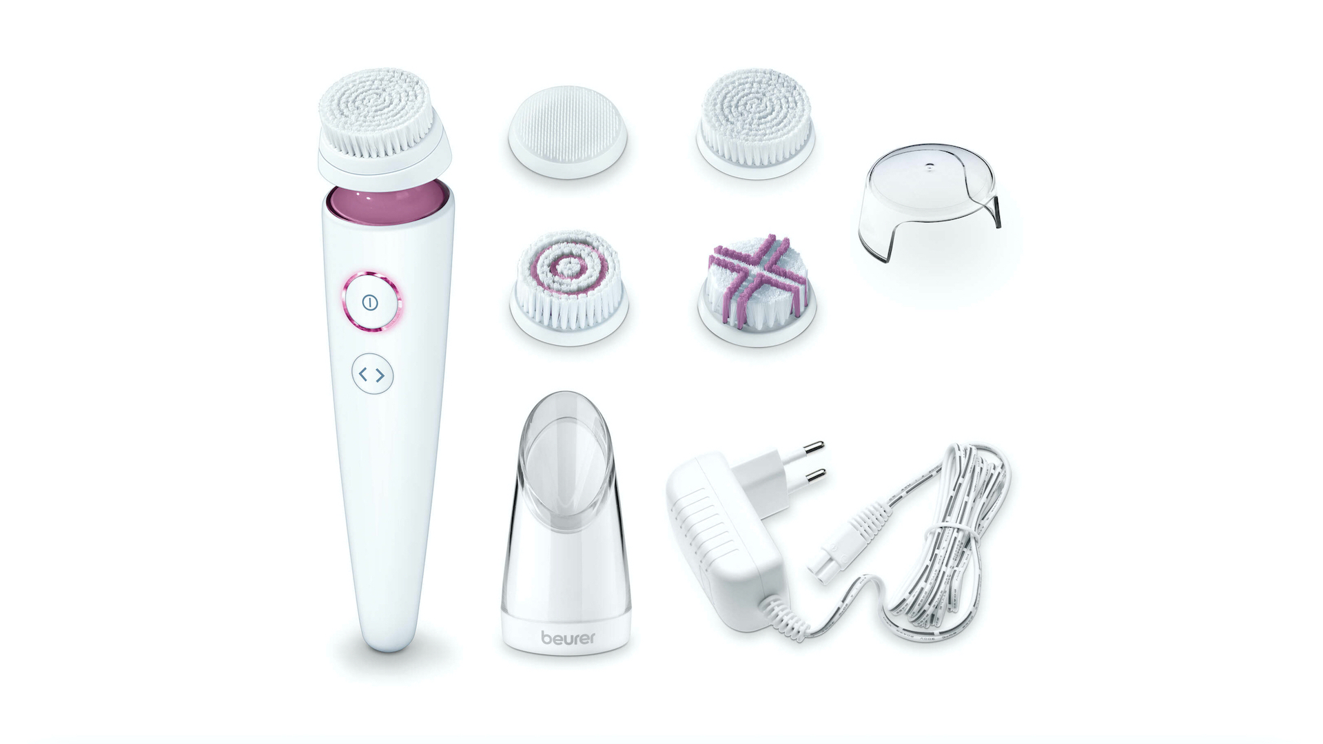 Laite koostuu kädessä pidettävän kasvoharjan lisäksi jalustasta, laturista ja neljästä harjaspäästä. Jalusta on jämäkkää tekoa, joten Beurer FC 95:n ei tarvitse pelätä kaatuilevan kylpyhuoneen tasolla.
