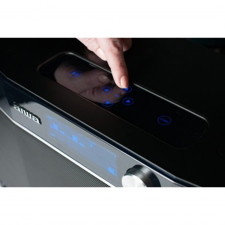 Aiwa Exos-9:ää ohjataan kosketuspaneelista, joka valaistuu koskettaessa. Näytöstä voi valita jonkin neljästä esiasetetusta taajuuskorjaimen asetuksesta, jotka sopivat eri genreille, tai luoda oman asetuksensa. Tietenkin myös soiton aloitus ja pysäytys onnistuvat samasta paikasta. Linkitysnapista saa yhdistettyä kaksi Exos-9-kaiutinta stereoksi tai soittamaan kahdessa eri huoneessa. Bluetoothin vaihtoehdoksi löytyy myös aux-liitäntä. USB-portti mahdollistaa puhelimen latauksen.