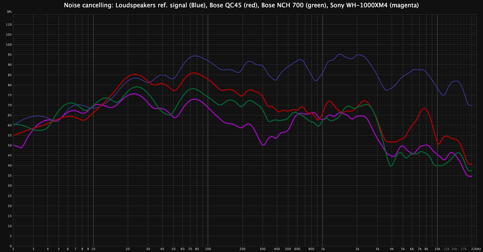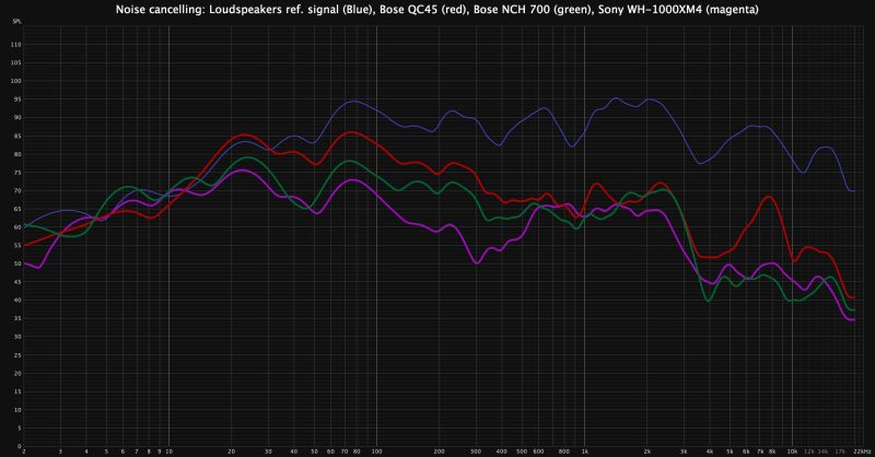 Ulkoa tuleva ääni vaimenee tehokkaasti ja esimerkiksi junan humina sulkeutuu kokonaan pois. Korkeammat äänet pääsevät helpommin läpi kuin NCH 700- ja Sony WH-1000XM4-kuulokkeilla Huomaan sen esimerkiksi käyttämäni näppäimistön kalkatuksesta, mikä kuuluu QC45:llä selvemmin kuin kahdella muulla. Sonyn vastamelu on 3 dB tehokkaampaa kuin QC45, mutta sitä ei juuri huomaa käytännössä.