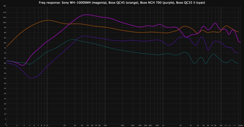 Bose on aina ollut hyvä vaimentamaan melua, ja myös QuietComfort 45 on vastamelultaan erinomainen. Niissä tosin kuuluu odotettua enemmän vastamelun sivutuotteena syntyvää suhinaa – sitä on selvästi enemmän kuin QC35 II- ja NCH 700-malleilla, joista viimeinen on kolmikon hiljaisin. Myös Sony WH-1000XM4 suhisee, mutta matalammalla taajuudella ja vähemmän huomattavasti kuin QC45.