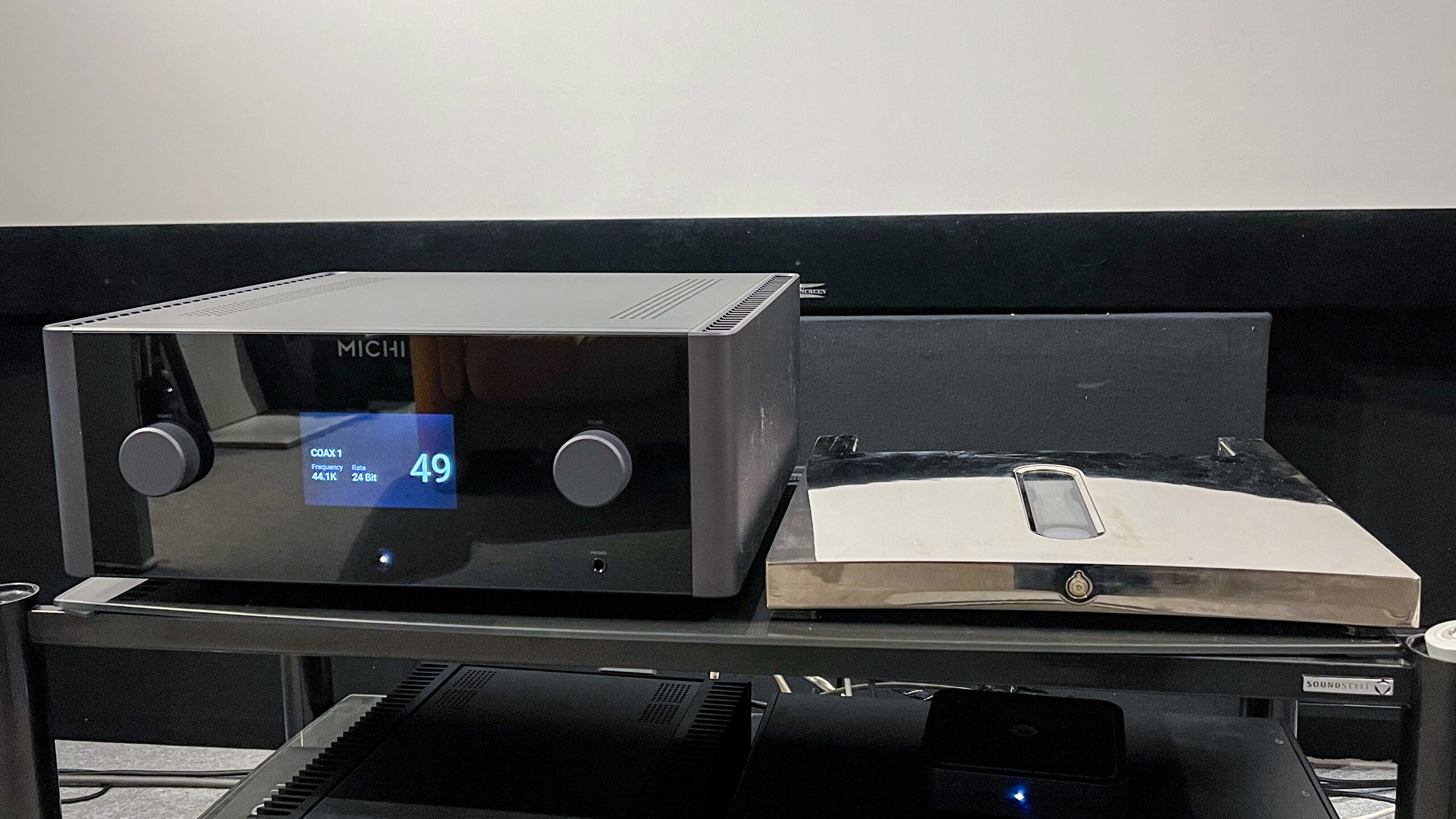 Näyttämölle eli testihuoneeseen astuu Michi X5. Michi on Rotelin highend-merkki, ja X5 on integroitu vahvistin 2 x 350 watilla ja 8 ohmilla. 44-kiloinen vahvistin näyttää tankilta Devialetin minimalistisen ja alle 10-kiloisen laitteen rinnalla. Ja siltä se kuulostaakin!