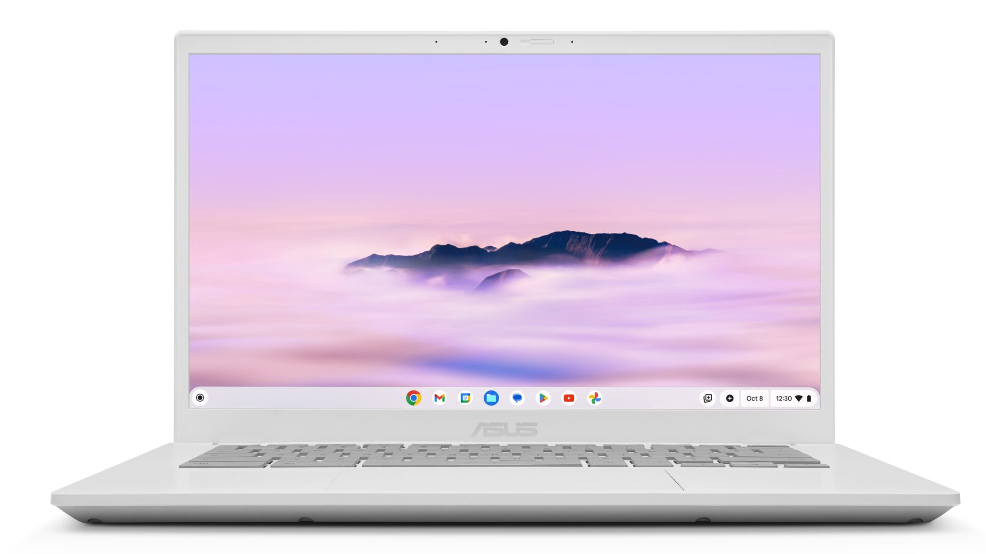 Asus Chromebook Plus CX34 erottuu Chromebookien harmaasta massasta helmenvalkealla kuorellaan. Tai kone ei itse asiassa ole täysin valkoinen, vaan täplikkään harmahtava, mikä tuo mieleen kierrätysmuovin. Ensin luulin koneen olevan hiukan pölyinen…