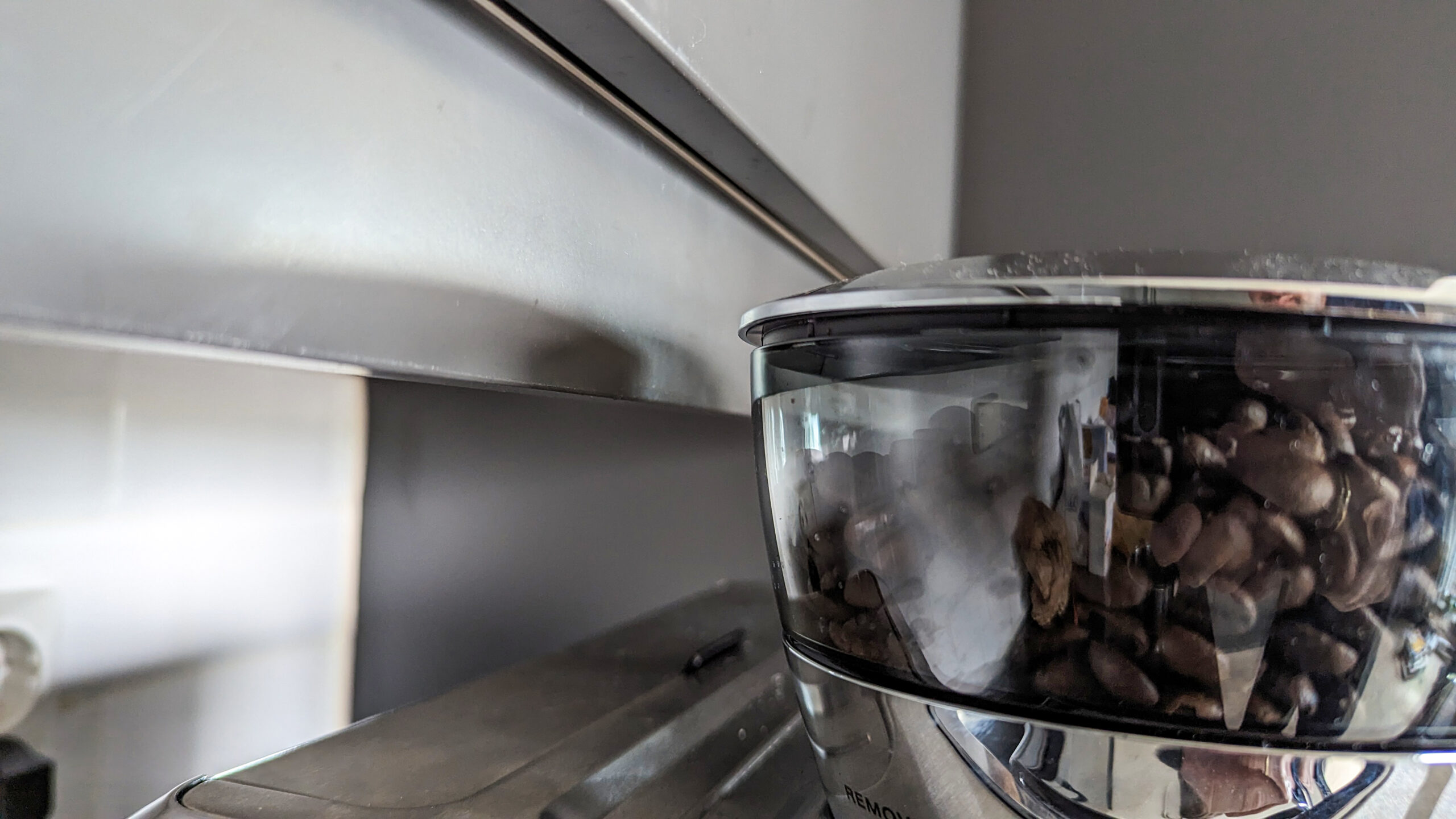 Toiseksi, kone on iso. Masiina vie leveyssuunnassakin tilaa, mutta myllyn takia laite on kaksi senttimetriä liian korkea mahtuakseen omassa keittiössäni yläkaappien alle. Kone on 46,5 cm korkea, joten monessa muussakin kodissa voi tulla sama ongelma vastaan – kannattaa mitata paikka etukäteen!