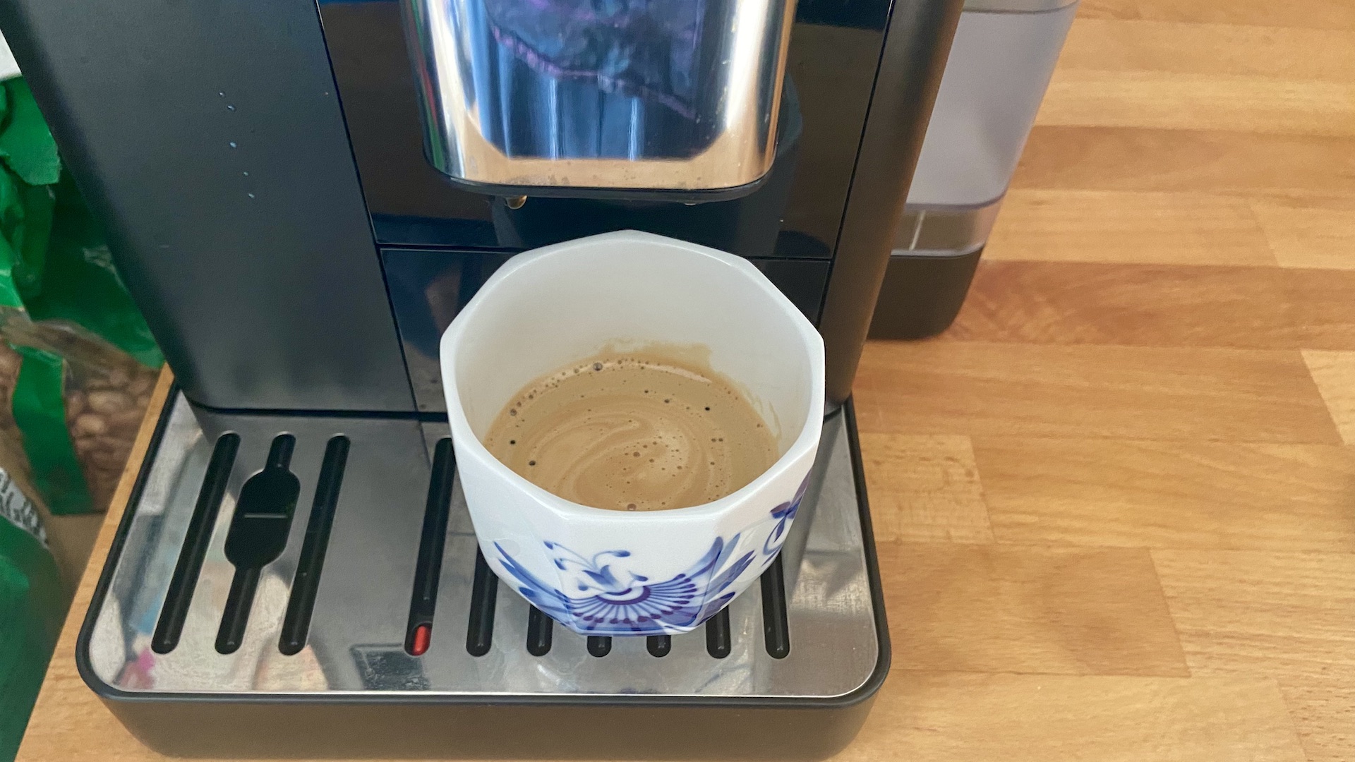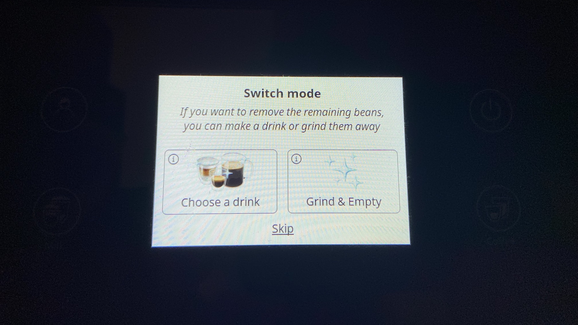 Kun säiliön irrottaa, jää myllyn suuaukolle aina jonkin verran papuja – noin 12 grammaa. Ne voi joko jauhaa pois heitettäväksi tai uuttaa halutunlaiseksi juomaksi. Näyttö opastaa selkeästi, kuinka säiliön vaihtamisessa edetään, joten operaatio sujuu vaivattomasti.