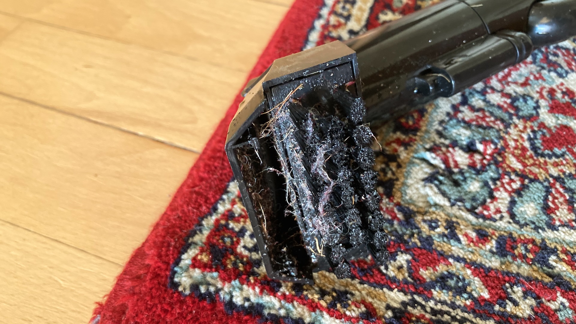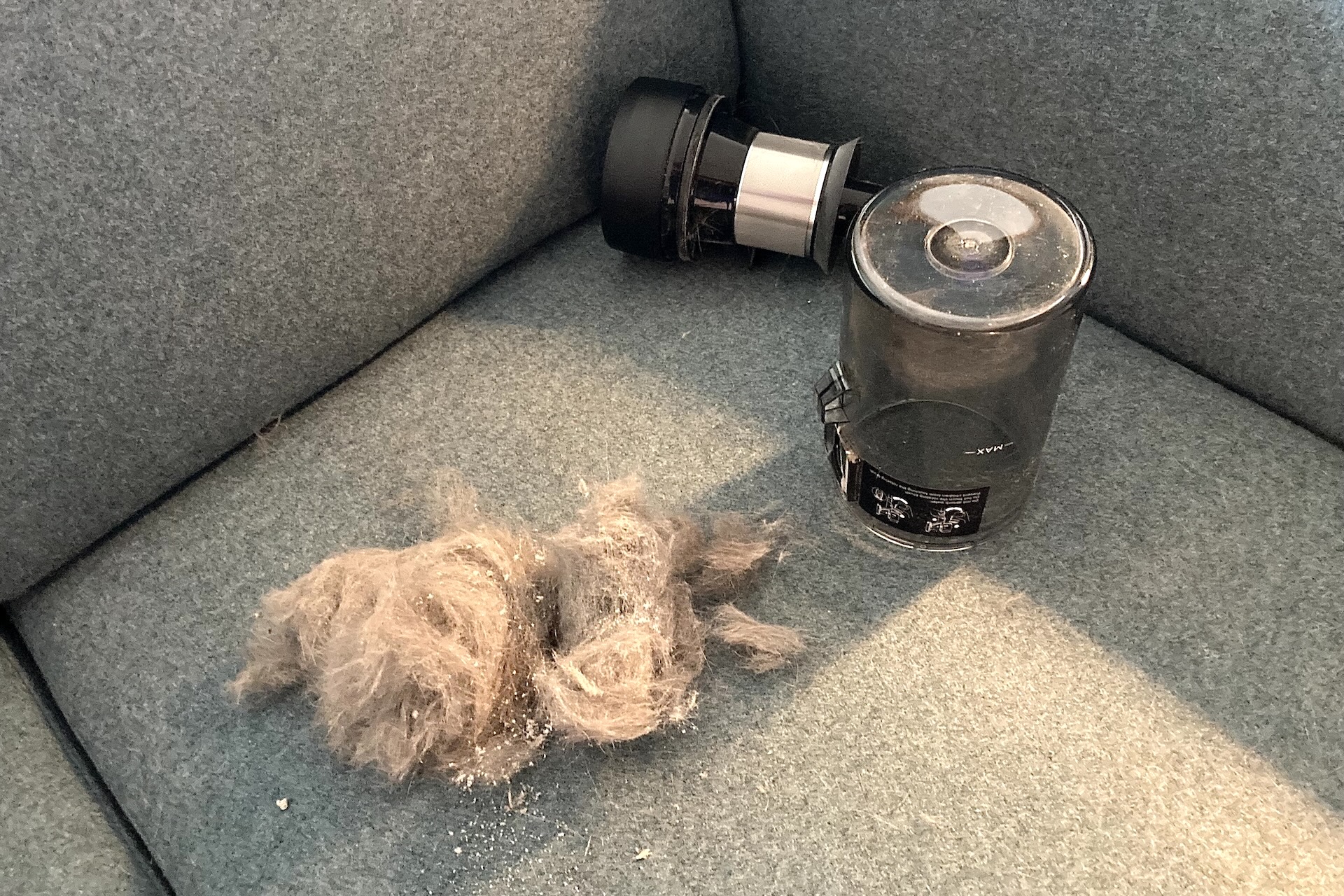 Nämä kaksi harjasuulaketta ovat H15 Mixin parasta antia. Pienellä suulakkeella sai tehokkaasti puhdistettua kissankarvoilla kuorrutetun kangassohvan. Kymmenen minuutin turbo-ohjelmalla H15 Mix keräsi kaksi kourallista kissankarvoja.