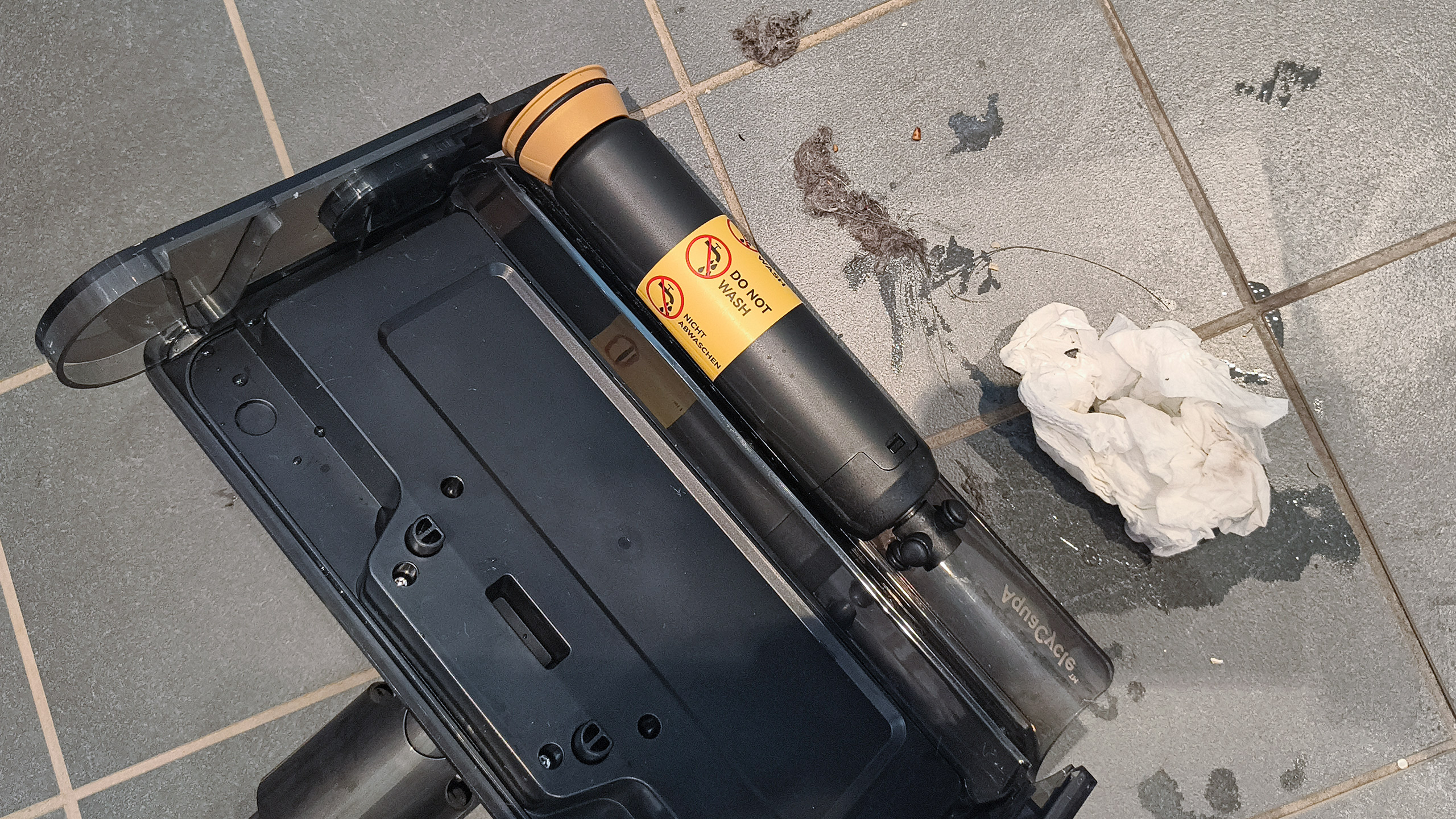 Kun lattiat on pesty, on likavesisäiliö (320 ml) ja jäljelle jäänyt puhdas vesi tyhjennettävä ja moppi pestävä. Vesisäiliöiden tyhjennys on helppoa, samoin kuin mopin irrottaminen, huuhteleminen ja vääntäminen kuivaksi. Jos lattioita ei ole imuroinut täydellisesti ennen moppaamista, likaa ja hiuksia menee helposti moppauspään takana olevaan osaan, jota ei saa irrotettua. Niitä on vaikea saada pois, ja osassa vieläpä lukee ”Do not wash”. Pyyhin osaa varovasti kostealla paperilla ja yritin puhallella pölyt pois. Jos vain imuroi huolellisesti ennen pesua, välttyy tältäkin vaivalta.