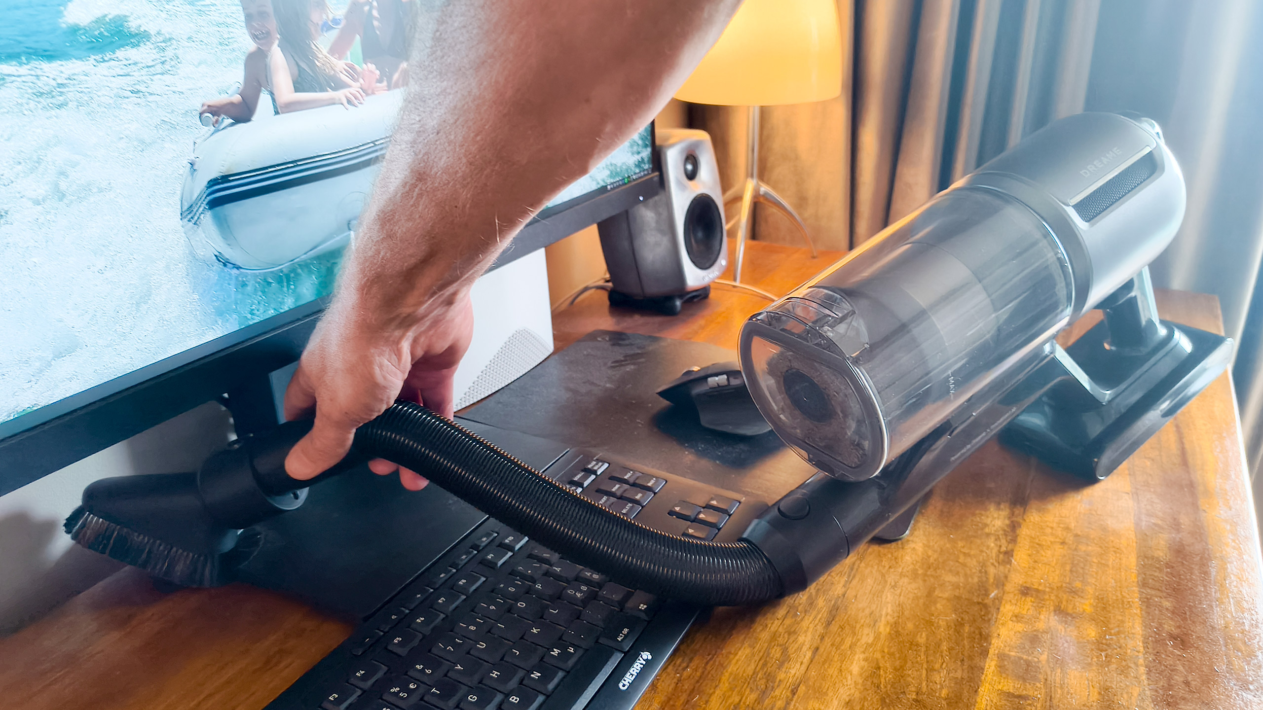 Jos käyttää jatkovartta, ylettää imuroimaan pidemmältä matkalta, jolloin rikkaimurin voi jättää pöydälle lepäämään eikä sitä tarvitse pitää kädessä. Kuva: Ola Larsson