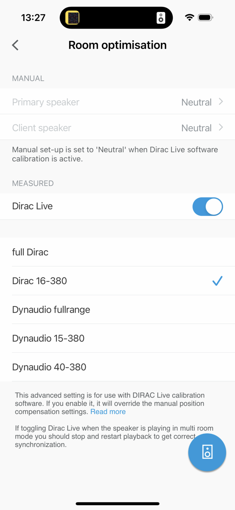Dynaudion Sebastian ja Michael asensivat ja kalibroivat kaiuttimet testihuoneeseemme ja tallensivat Dirac Liveen useita profiileita, joita pystyin käyttämään sovelluksella. Profiileja voi tehdä vaikkapa niin kutsutussa sweet spotissa kuuntelevalle tai kompensoimaan vasemman ja oikean kaiuttimen epätasapainoista sijoittelua.