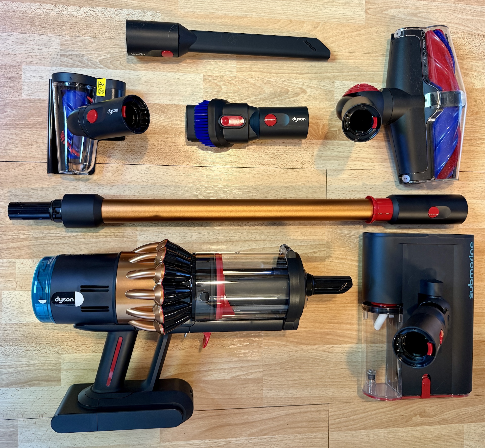 Moottoriyksikön lisäksi pakkauksesta löytyy irrotettava akku, laturi ja edelleen erittäin yksinkertainen seinäkiinnike. Rakosuulake ja yhdistelmäsuulake näyttävät niin ikään tutuilta. Sen sijaan varsi näyttää vähän erilaiselta kuin ennen ja siinä on uusi salaperäisen näköinen vipu. Lisävarusteisiin on tuotu uusia osia, ja moottoroitua Hair Screw -suulaketta on paranneltu, jotta verhoiltujen huonekalujen imurointi olisi entistäkin tehokkaampaa. Merkittävin uutuus on kuitenkin All Floor Cones Sense -lattiasuulake, jolla voi imuroida sekä kovat pinnat että matot.