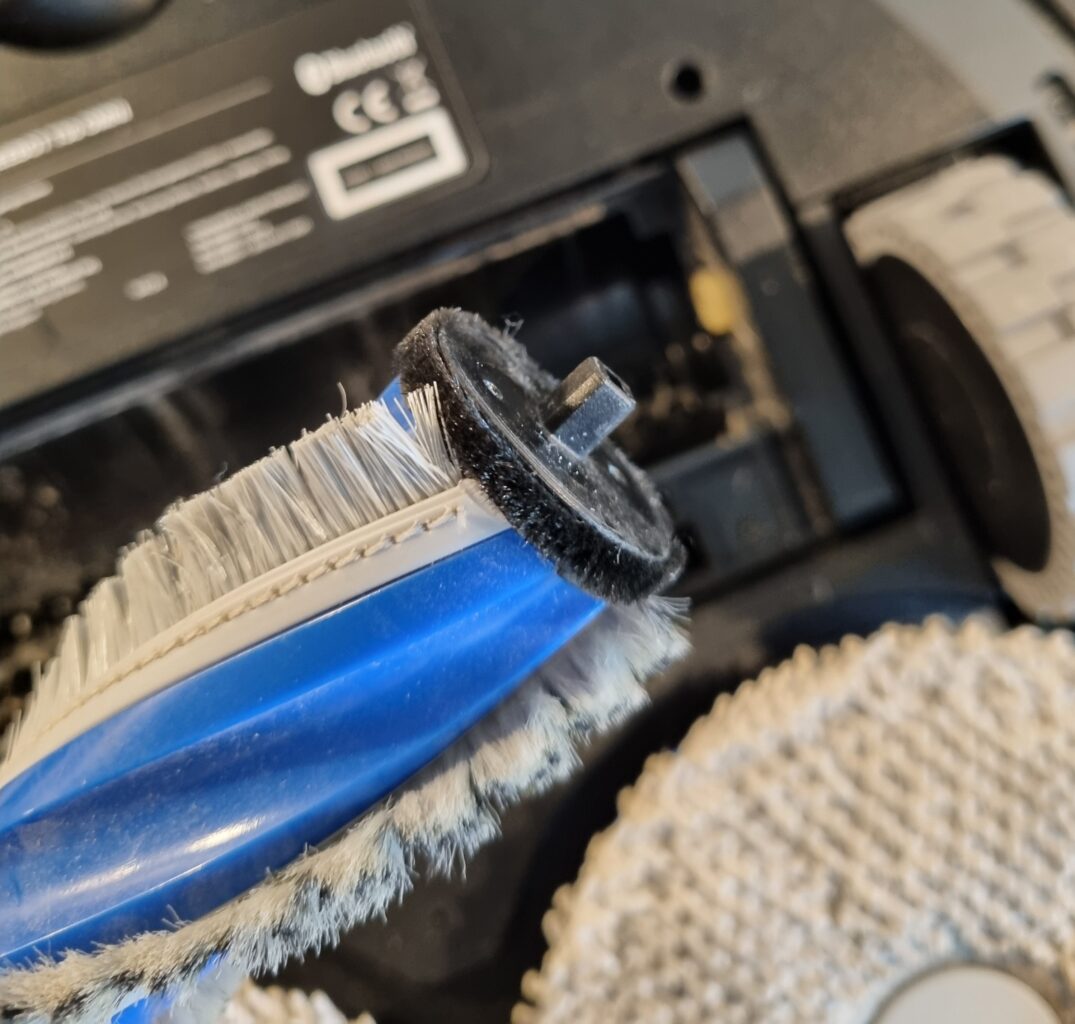 Hiusten kiertyminen harjaksiin on enemmän sääntö kuin poikkeus, joten robotti-imurin omistajan on putsattava harjakset säännöllisesti. Näyttää kuitenkin siltä, että Ecovacs on onnistunut ratkaisemaan yhtälön – toivottavasti tämä leviää pian muihinkin malleihin. Kuva: Åsa Warme Hallén