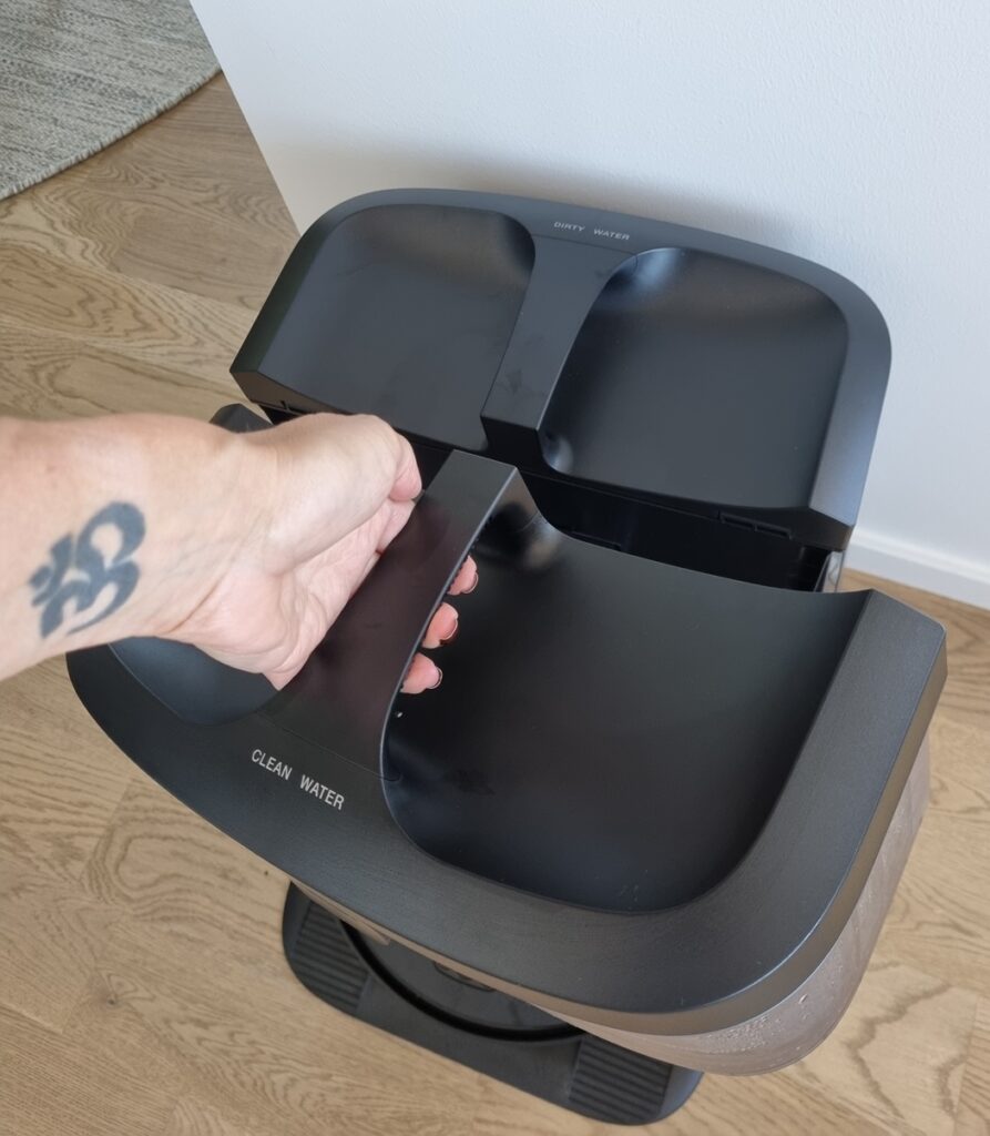 Lataus/tyhjennysasemaan kuuluu kaksi vesisäiliötä: toinen puhtaalle ja toinen likaiselle vedelle. Asema vie aika lailla tilaa, joten sen sijoittaminen kotiin ei välttämättä ole ihan helppo homma. Mutta tilannehan on sama merkistä riippumatta.