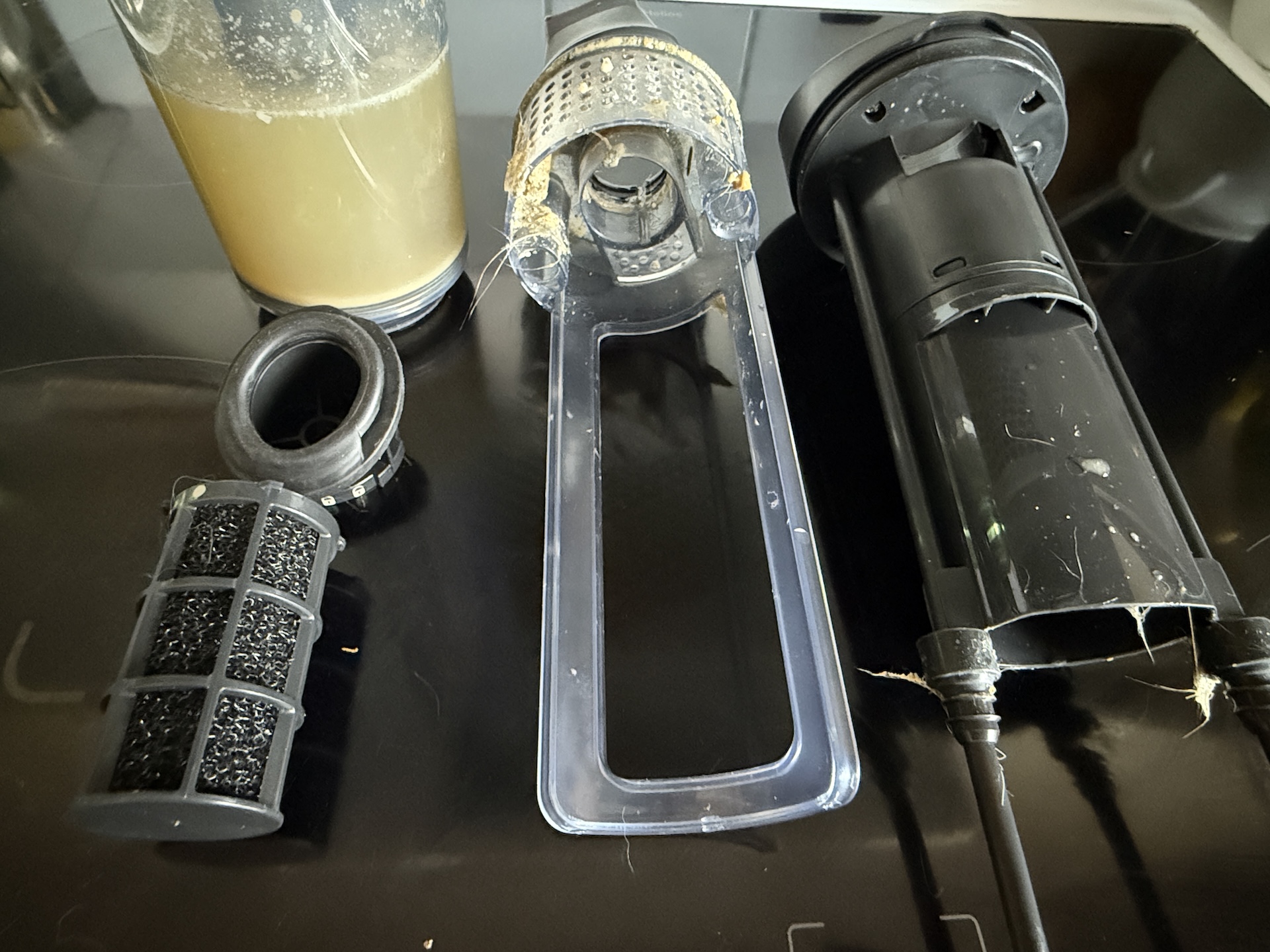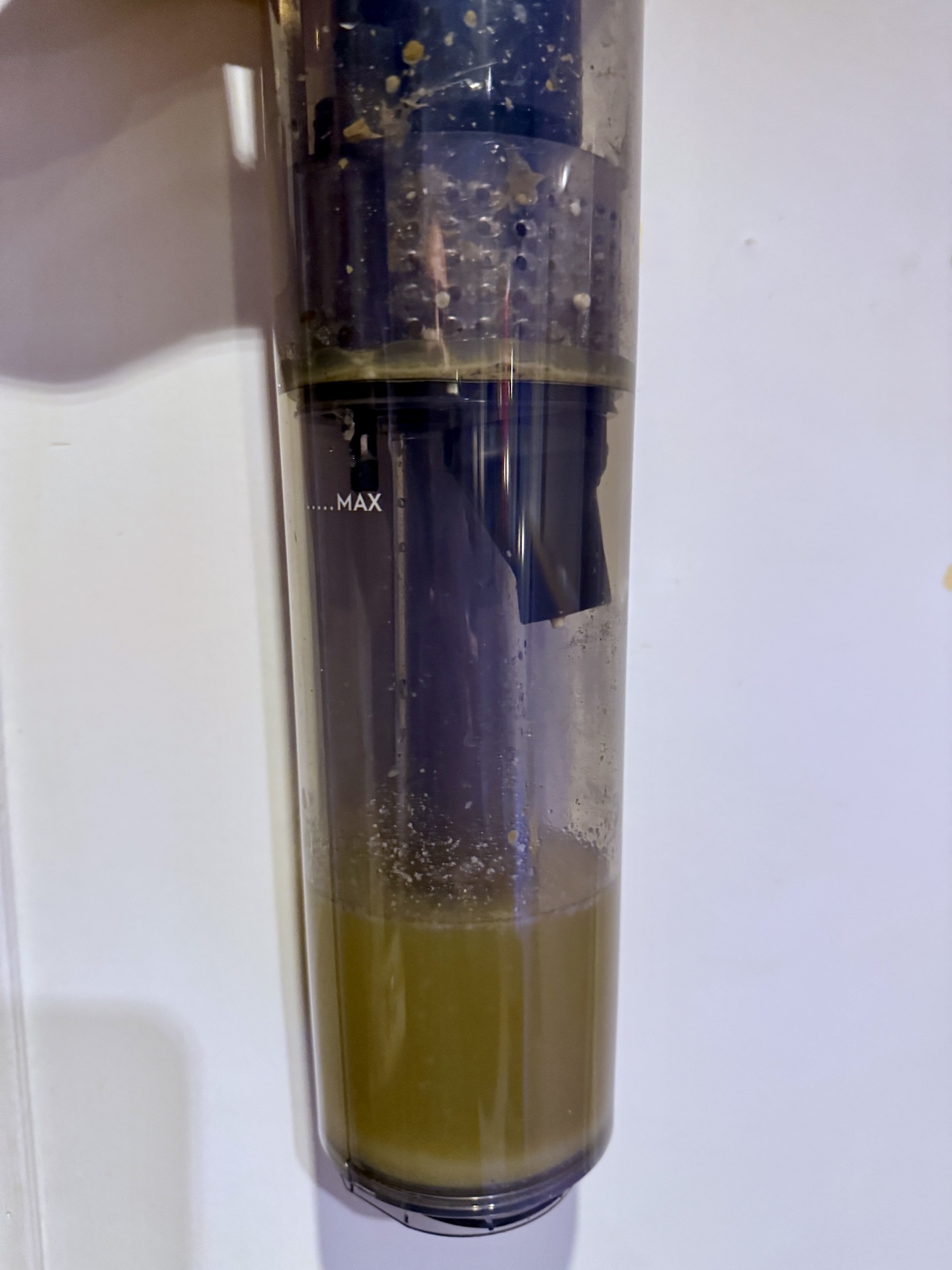 Likavesi kerääntyy yllättävän suureen säiliöön, joka on sijoitettu keskelle lattiapesuria. En ihan ymmärtänyt paikkavalintaa, ennen kuin tyhjensin säiliön. Säiliö irtoaa napin painalluksella, jonka jälkeen sisäsäiliö vedetään irti putkesta. Se osoittautui suodatinjärjestelmäksi, joka erottelee isommat roskat likavedestä. Aiempiin testaamiini lattianpesuratkaisuihin verrattuna tämä on suorastaan nerokas. Likaveden voi kaataa suoraan viemäriin ja roskat ravistella erikseen roskapussiin – eipähän tarvitse pelätä, että viemäri menisi tukkoon!