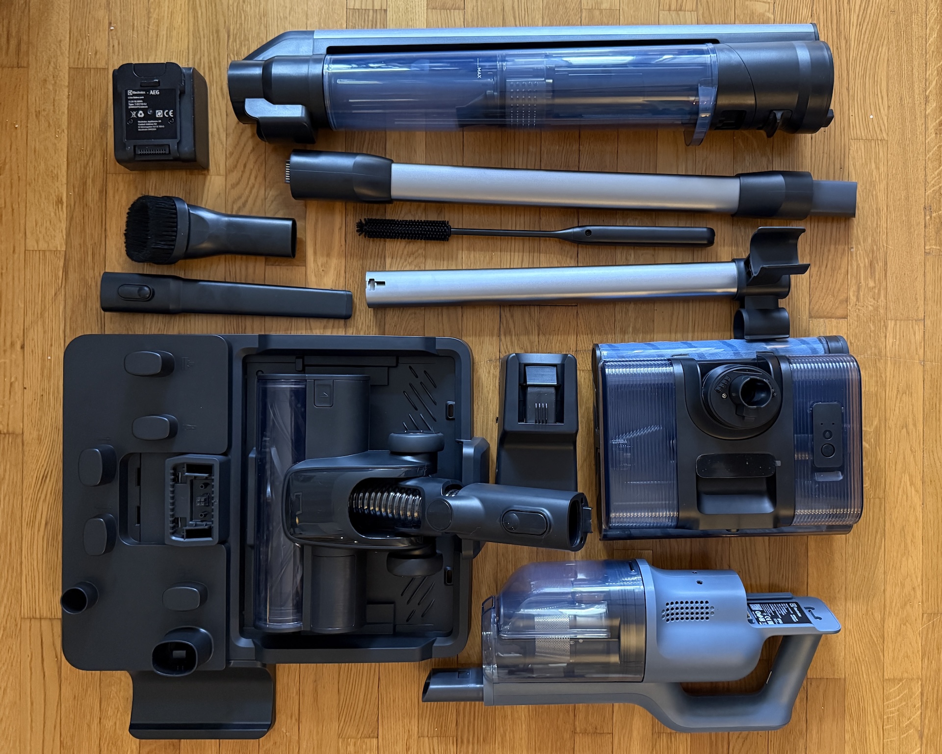 Heti alkuun on todettava, että kyseessä ei ole mikään pieni laite, jota voi huomaamattomasti pitää huoneen nurkassa. Syy kokoon on, että käytännössä EW82U2DB käsittää kaksi eri laitetta, joilla vain on yhteinen moottori. Latausasema on jo itsessään jättimäinen, ja siinä voi säilyttää lattiapesuria. Erikseen on pidike imurin varrelle sekä pölysuulakkeelle, rakosuulakkeelle ja puhdistusharjalle. Latausasema toimii latauksen lisäksi myös mopin pesuasemana.