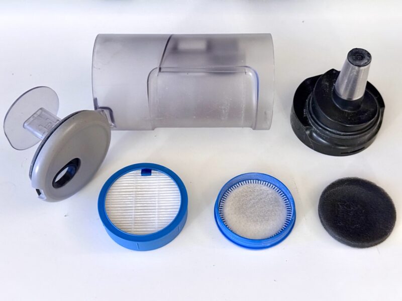 Pölysäiliö irtoaa myös napista painamalla ja vetämällä ulos. Säiliön pohja suunnataan roskapussia kohden ja avataan kansi, jolloin suurin osa roskasta tippuu pussiin. Säiliössä ei ole ärsyttäviä notkelmia ja mutkia, joihin pöly jäisi jumiin, joten kaiken saa helposti ulos ilman kaivelua. Kaksi suodatinta on helppo vetää ulos ja puhdistaa keittiön hanan alla. Toinen suodatin kuuluisi vaihtaa kerran vuodessa ja toinen kaksi kertaa vuodessa.