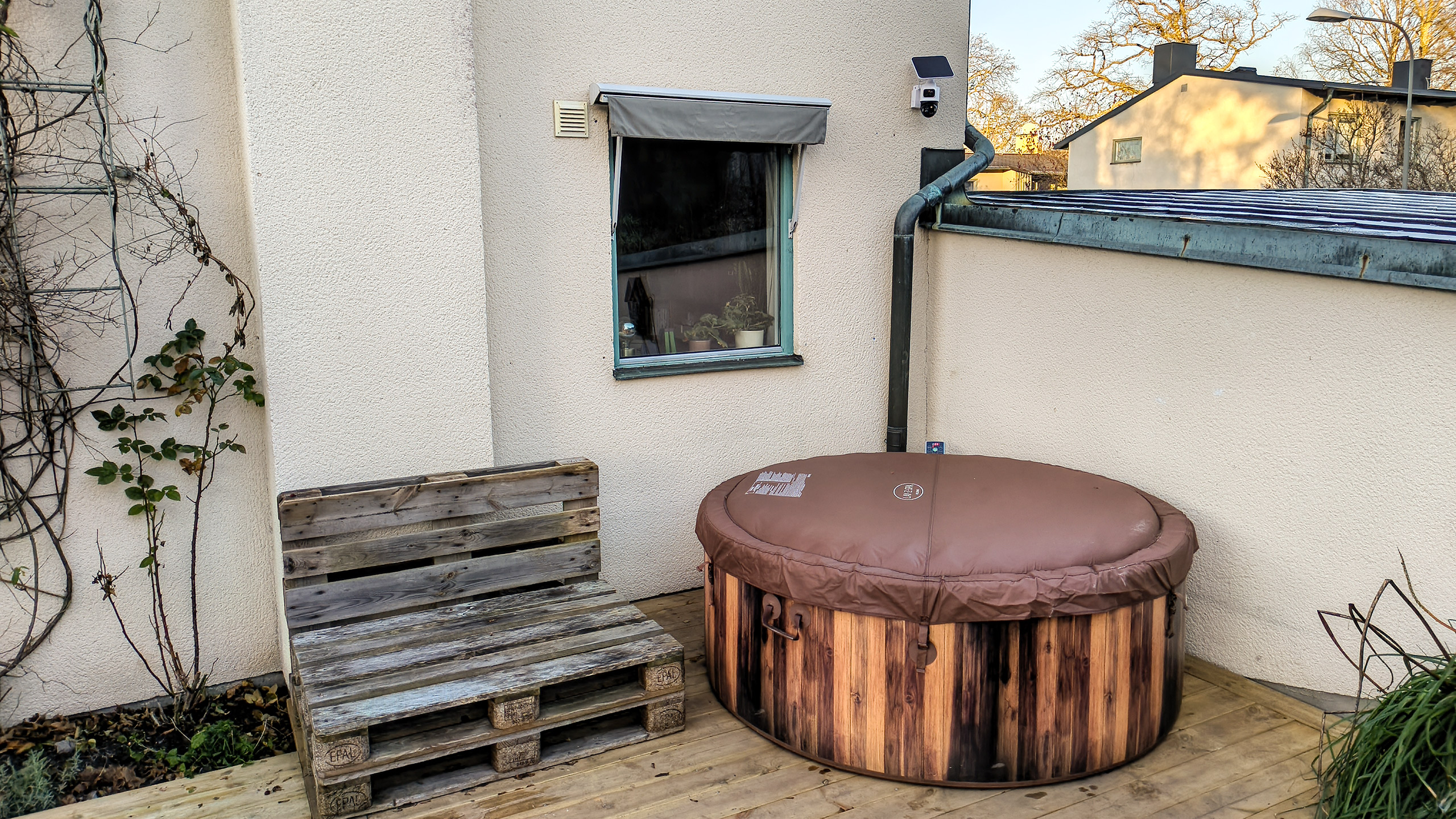 Asensin toisen kameran pyörävarastoon, joka jää oman taloni ja naapurin väliseen varjoon, jonne ei aurinko juuri yllä. Vaikka asensin kameran aurinkopaneelit katolle, ei aurinkoa ollut tarpeeksi, vaan akku tyhjeni alle kahdessa viikossa. Tällaisessa paikassa virtakaapeli on välttämätön. Kuva: Ola Larsson