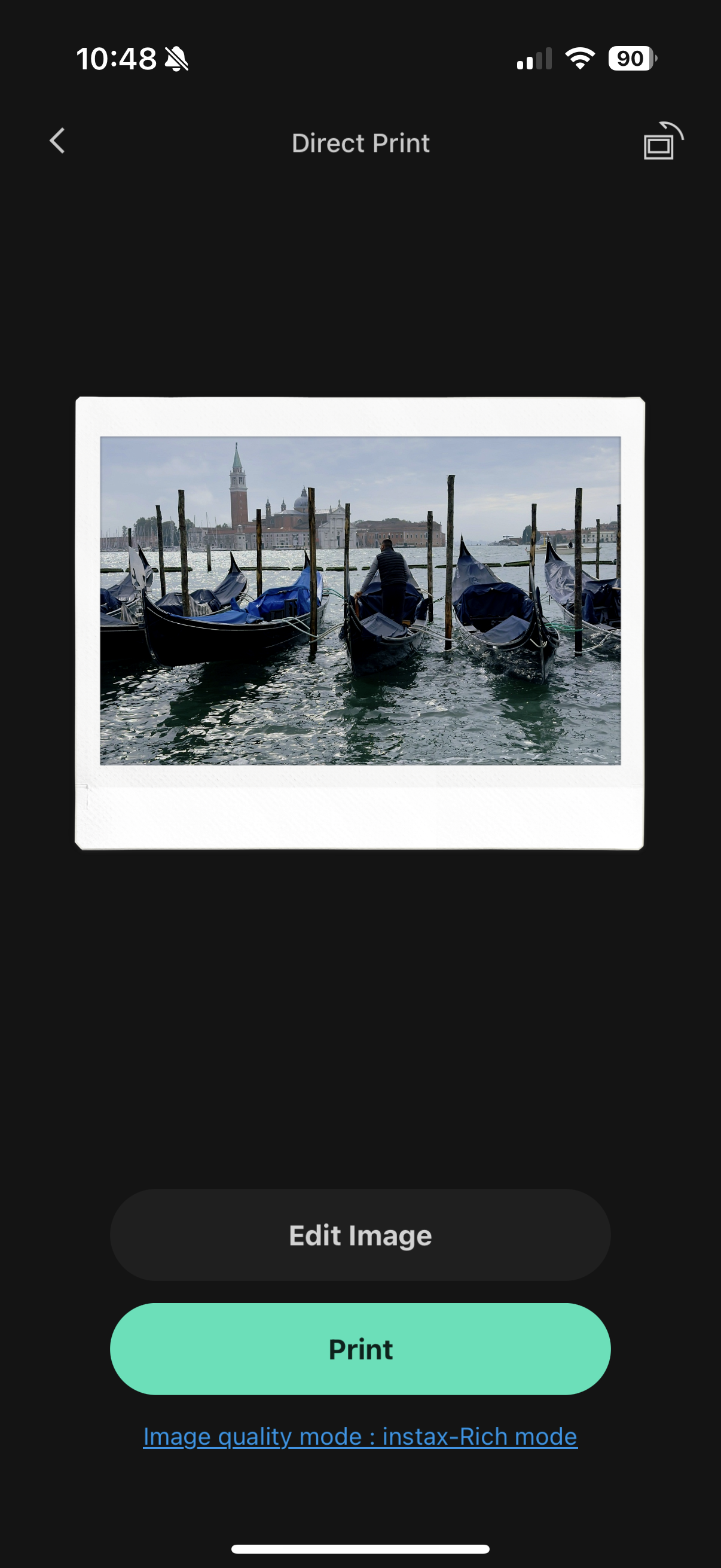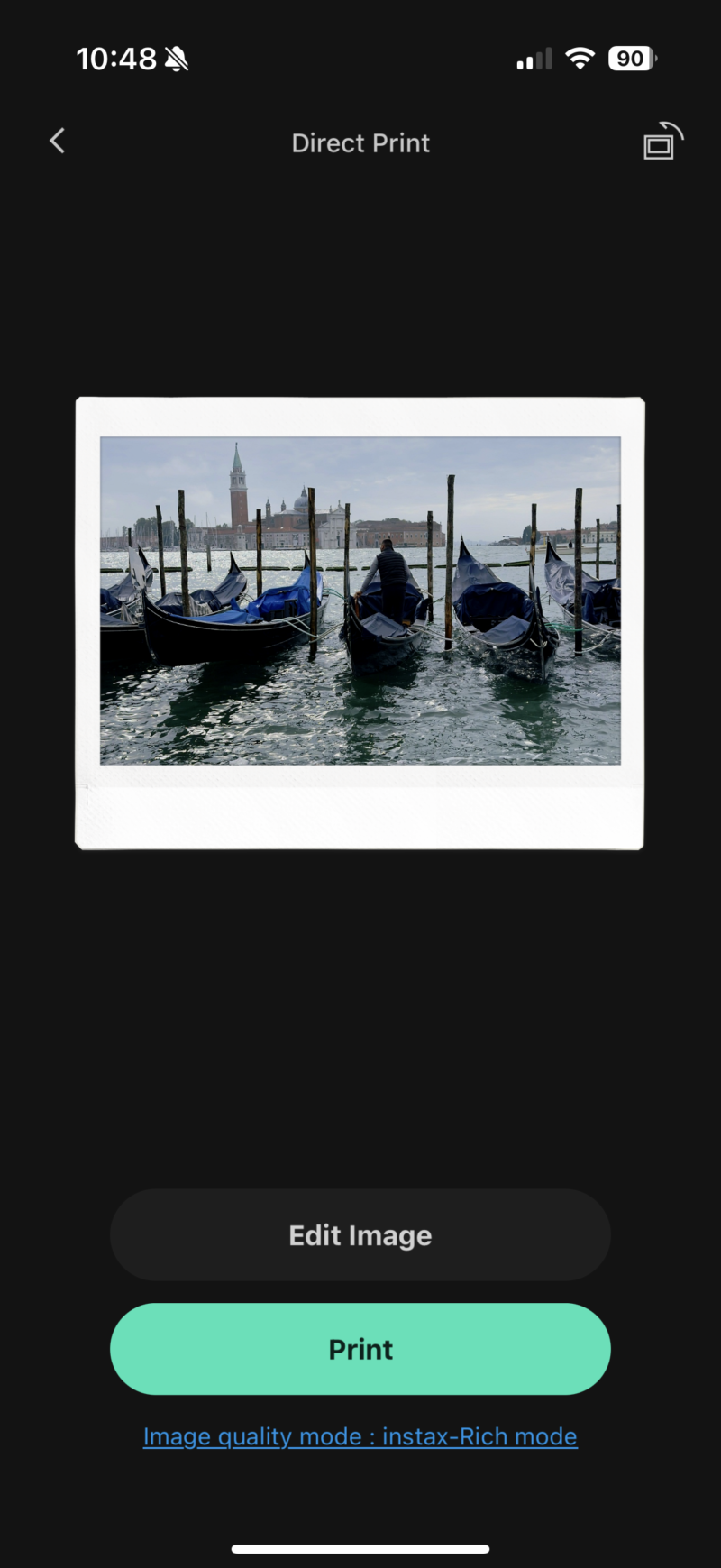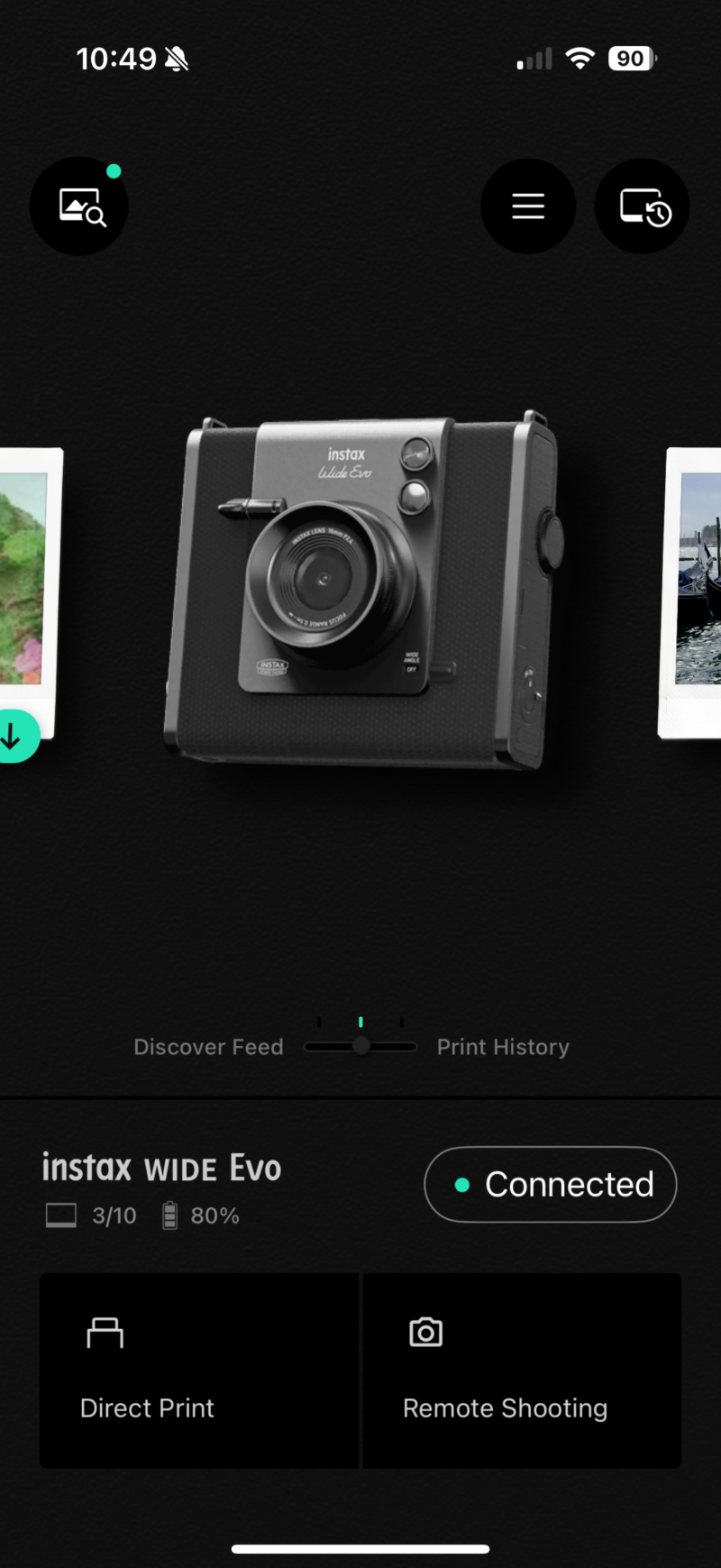 Kamera voi tulostaa myös puhelimella otettuja kuvia, kunhan lataa Instax-sovelluksen. Sovelluksesta valitaan kameraksi Wide Evo, jonka jälkeen kuvat voi valita puhelimelta, lisätä niihin efektejä, kehyksiä ja tekstiä ja lopuksi tulostaa. Homma toimii myös toisin päin, eli Wide Evolla otettuja kuvia voi siirtää puhelimeen ja jakaa haluamallaan tavalla. Sovelluksella onnistuu myös kameran etäohjaus, mikä on kätevää, jos kameran haluaa asettaa vaikkapa jalustalle.