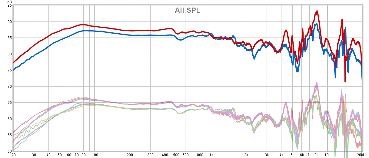 Taajuusvaste. Oikean ja vasemman kanavan keskiarvo ylhäällä, kummankin kanavan viisi mittaustulosta alla. Hieman laskeva taajuuskäyrä bassosta diskanttiin noin 5 kHz:n kohdalla viittaa lämpimään äänikaraktääriin. Se voisi kääntyä tummaksi, ellei kuulokkeissa olisi niin salamannopeaa transienttivastetta. Noin 8 kHz:n kohdalla on vahvistus, joka kuitenkin pysyy ilmavana, joten ääni ei käy pakotetuksi tai värity. Päinvastoin: mielestämme HiFiMAN Sundara sopii myös ääniteknikon työvälineeksi, kunhan tämän vahvistuksen huomioi. Mittaukset tehty MiniDSP EARS -kuulokemikrofonilla ja Room EQ Wizard -ohjelmalla.