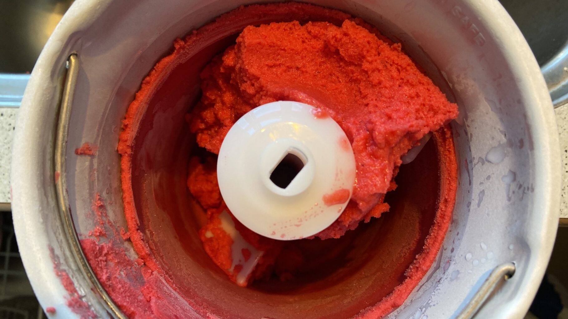 Valitsin sorbetille kiinteimmän sorbettiasetuksen, jolla kesti 59 minuuttia. Ei ehkä kuulosta vaikuttavalta, mutta massa oli tulikuumaa lisätessäni sen koneeseen, joten mielestäni suoritus ei ollut hullumpi.