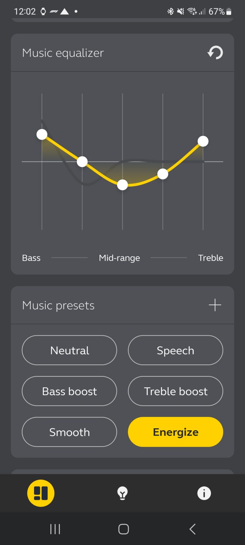 Valmiita ääniasetuksia on kuusi, ja niitä voi jatkojalostaa itsekin. Lisäksi voi luoda kokonaan omia asetuksia. Neutraali asetus on nimensä mukaisesti melko lattea ja neutraali. Äänikirjoille ja podcasteille paras asetus on tietysti Speech. Bass Boost, Treble Boost, Smooth ja Energize kannattaa valita kuunneltavan musiikkigenren mukaan. Omalla treenilistallani on paljon rockia ja popia, ja jumaloin Volbeatia. Treenilistani pääsi parhaiten oikeuksiinsa Bass Boostin kanssa, jolloin basso sai kivaa ekstrapotkua.