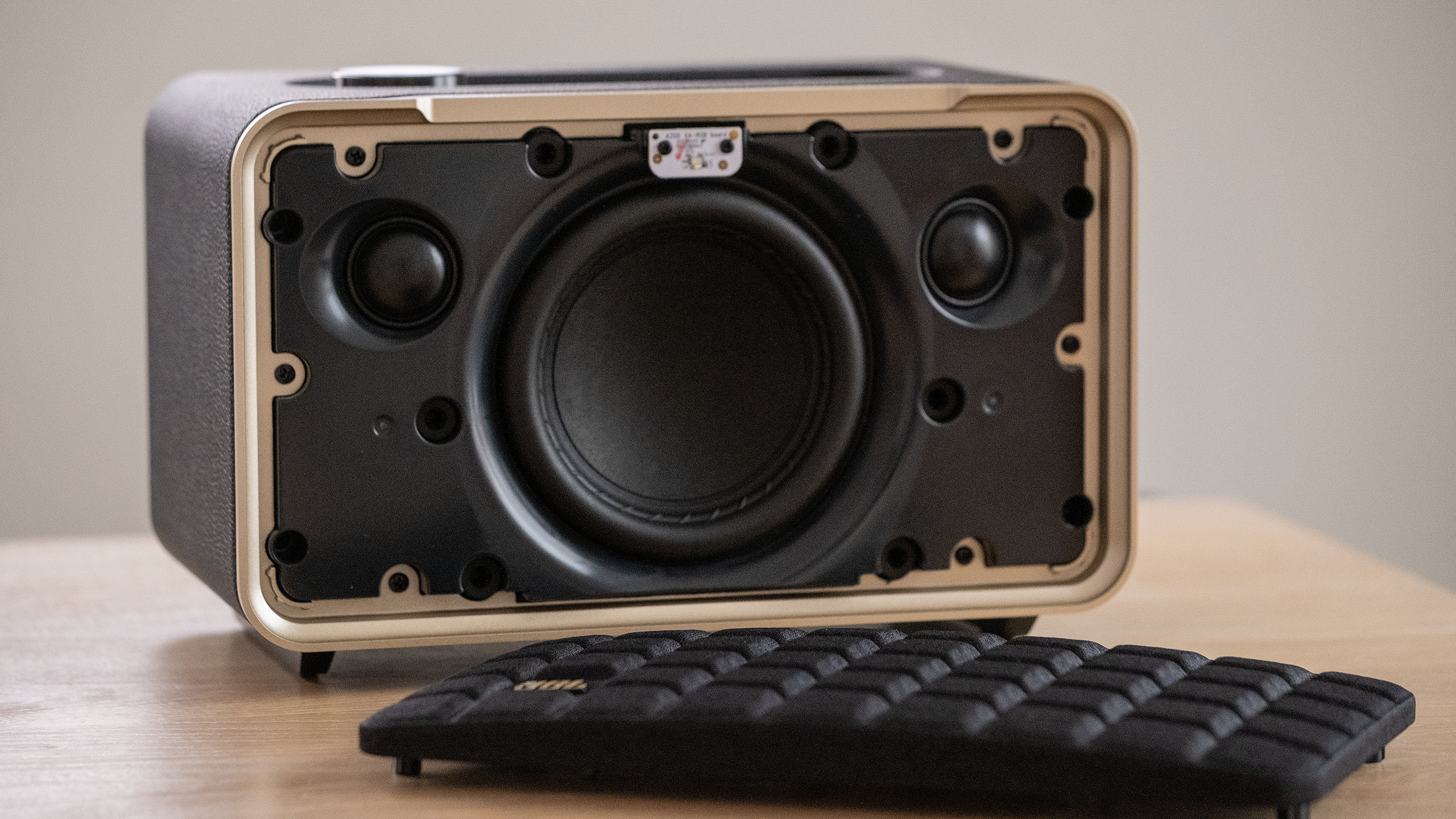 Jos mustan Quadrex-vaahtomuovin ottaa varovasti irti, paljastuu alta 5-tuumainen bassoelementti ja kaksi 25-millistä diskanttielementtiä. Ovaalia passiivisäteilijää ei näe, sillä se on piilossa kaiuttimen pohjassa. Passiivisuudestaan huolimatta sen kyllä huomaa, kun volyymia kääntää isommalle: bassontoisto on kaiuttimen kokoa muhkeampi.