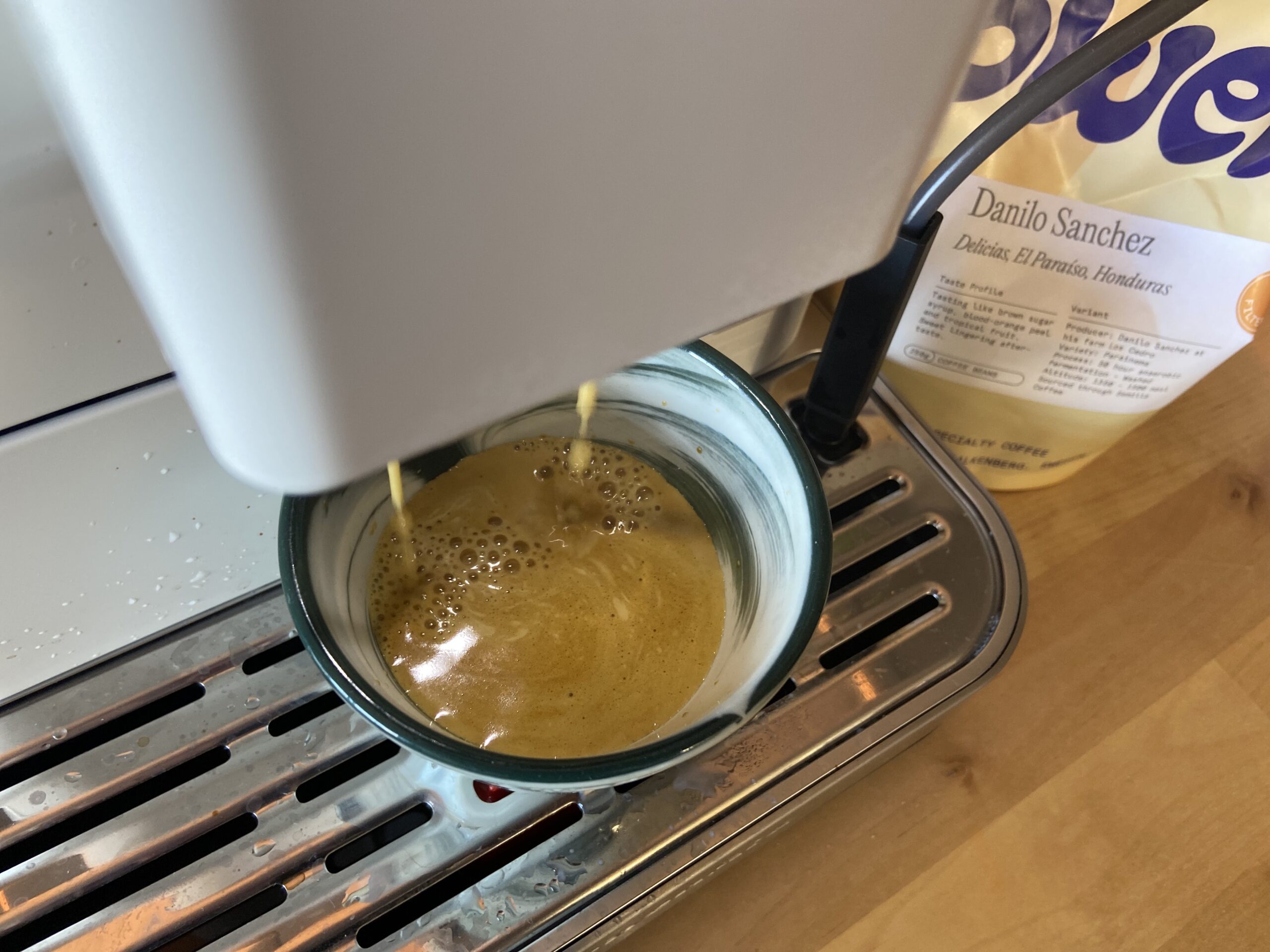 Myös kalliit, melko vaaleapaahtoiset pavut pääsevät oikeuksiinsa KF8-koneella, tässä tapauksessa anaerobisesti fermentoidut honduraslaiset pavut (suosikkini!). Pavut maistuivat karamellimaisen makeilta ja sitruksisilta, joissa hapokkuus oli kohdillaan. Espresso oli hyvä ja monitahoinen eikä se vaatinut koneelta muuta kuin asetuksen kuumimmalle lämpötilalle. KF8 ei tarjoa sen enempää toimintoja kuin halvemmatkaan koneet, mutta sillä saa helposti todella hyvää kahvia, mikä korvaa valinnanvaran puutteet. KF8 on myös todella hiljainen jauhaessaan ja valmistaessaan kahvia! Espresso valmistuu 45 sekunnissa ja cappuccino 1 minuutissa ja 23 sekunnissa.