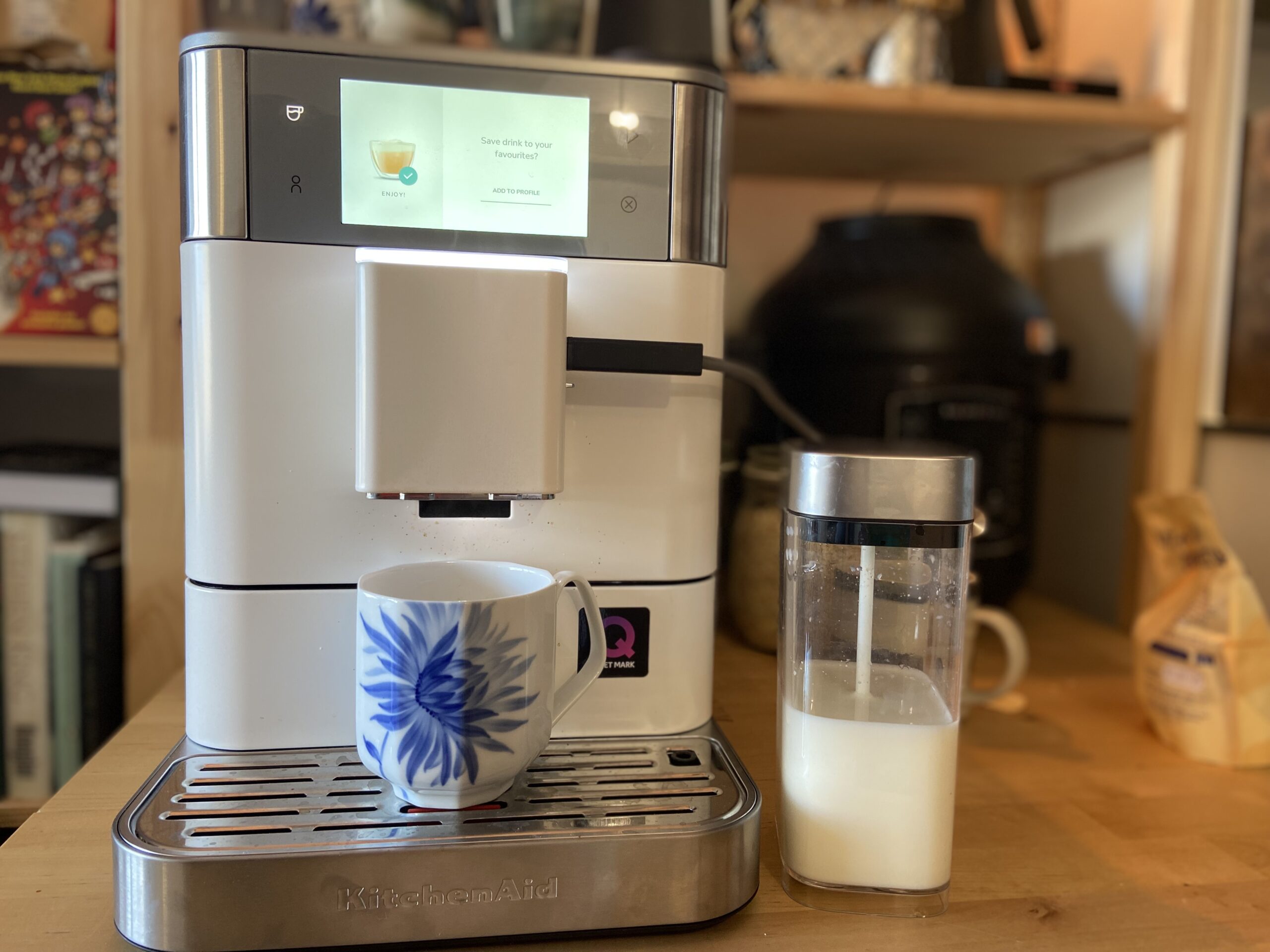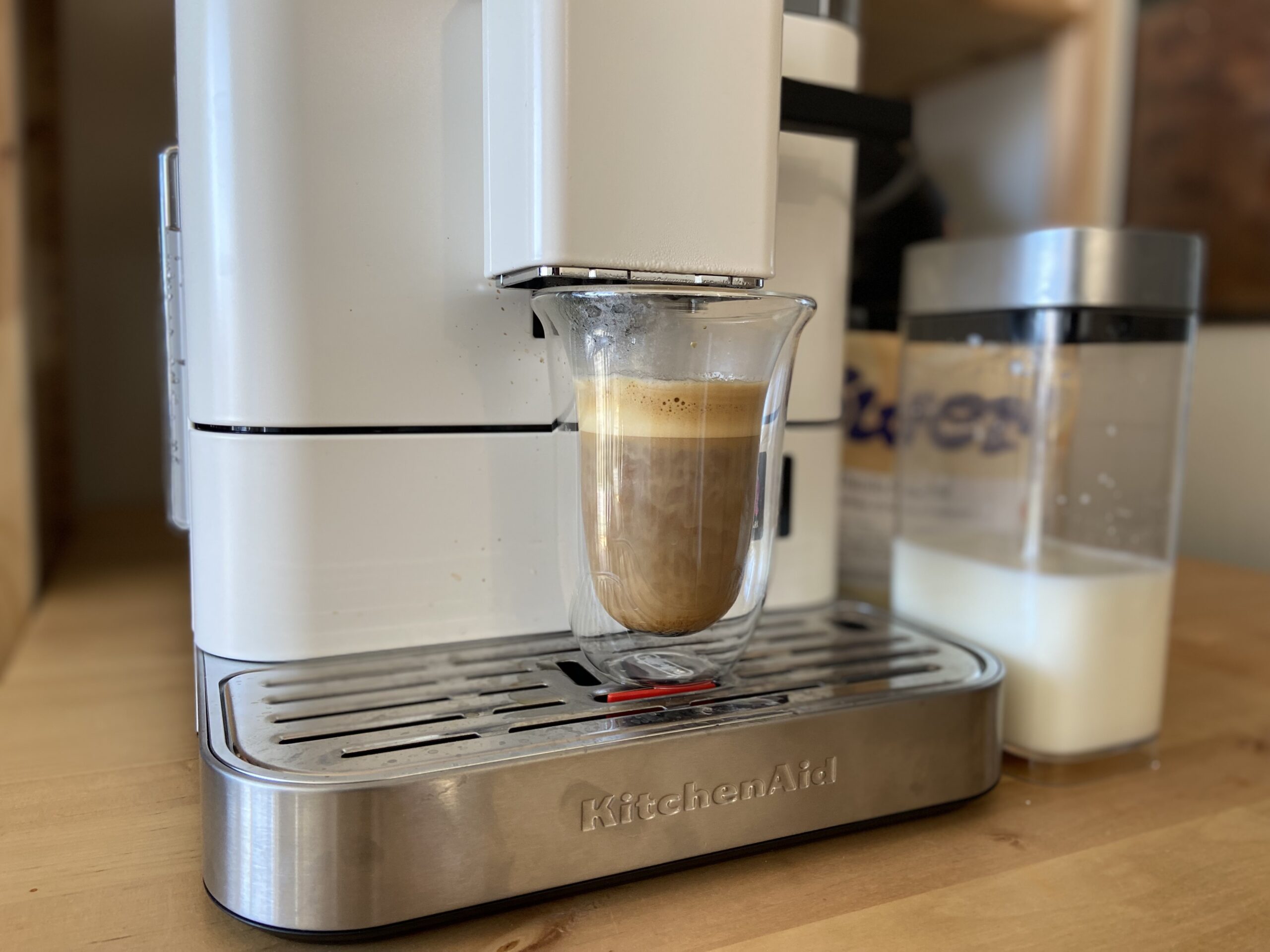 Mukana tuleva maitokannu on tilavuudeltaan 0,8 litraa. Kannun kansi ei istu tiiviisti, kuten nykyään näyttää olevan tapana – trendi, jota en ymmärrä enkä arvosta. Vaahdon määrää ei pysty säätämään, vaan on valittava joko maitovaahto (kuten cappuccinoon) tai höyrytetty (esimerkiksi latteen). Kumpikin on erinomaista sekä lehmänmaidosta että kasvimaidosta valmistettuna. Latten tekstuuri on markkinoiden parhaimmistoa: pehmeää ja miellyttävää. Kuten lähes kaikilla täysautomaattisilla koneilla, ei latte yllä ihan kahvilatasolle, mutta KF8 pääsee laadussa lähemmäs kuin useimmat espressokoneet.
