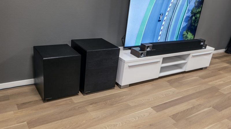 Kotiteatterihan ei ole mitään ilman bassoa, ja tässä tapauksessa matalimmista taajuuksista huolehtii 12-tuumainen järkäle. Subwoofer on 50 cm korkea ja varmaankin suurin koskaan testaamamme langaton subwoofer – tämän luulisi sopivan hyvin ison soundbarin ääneen!